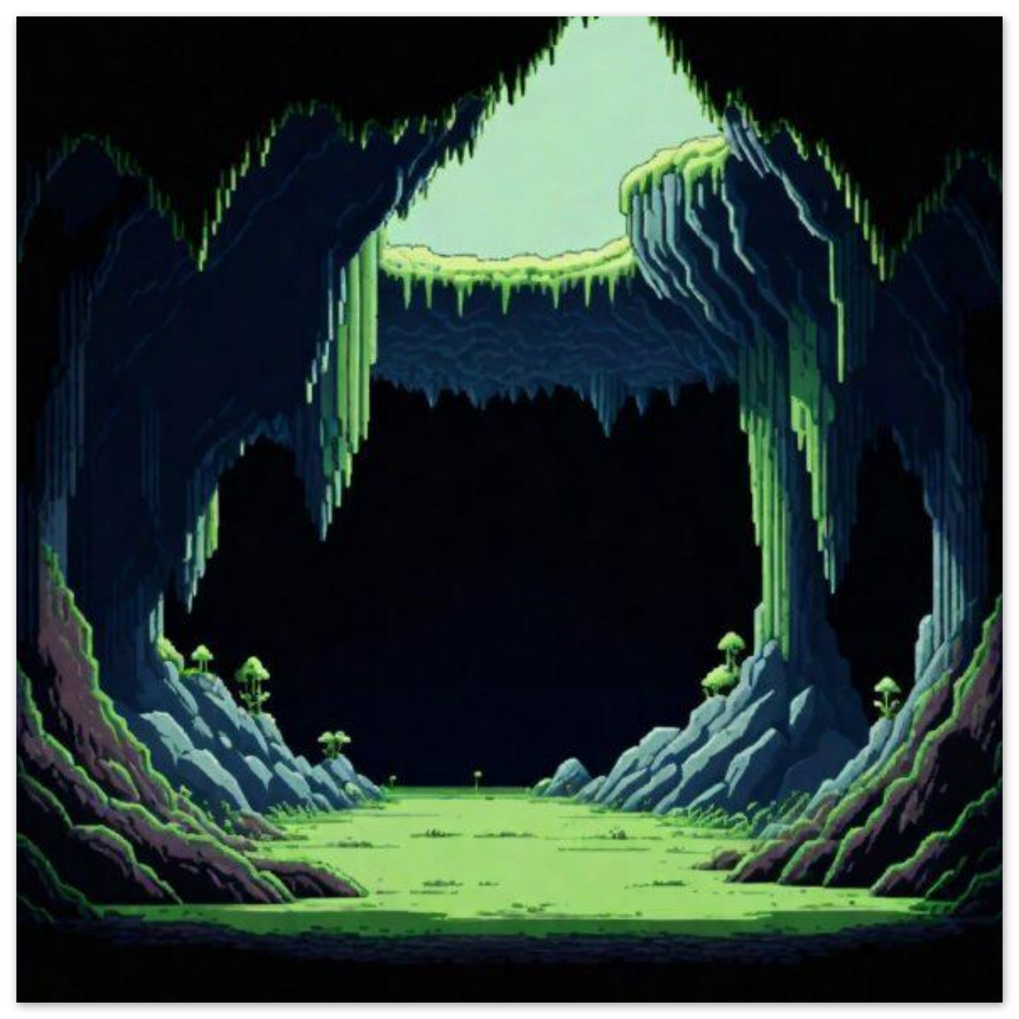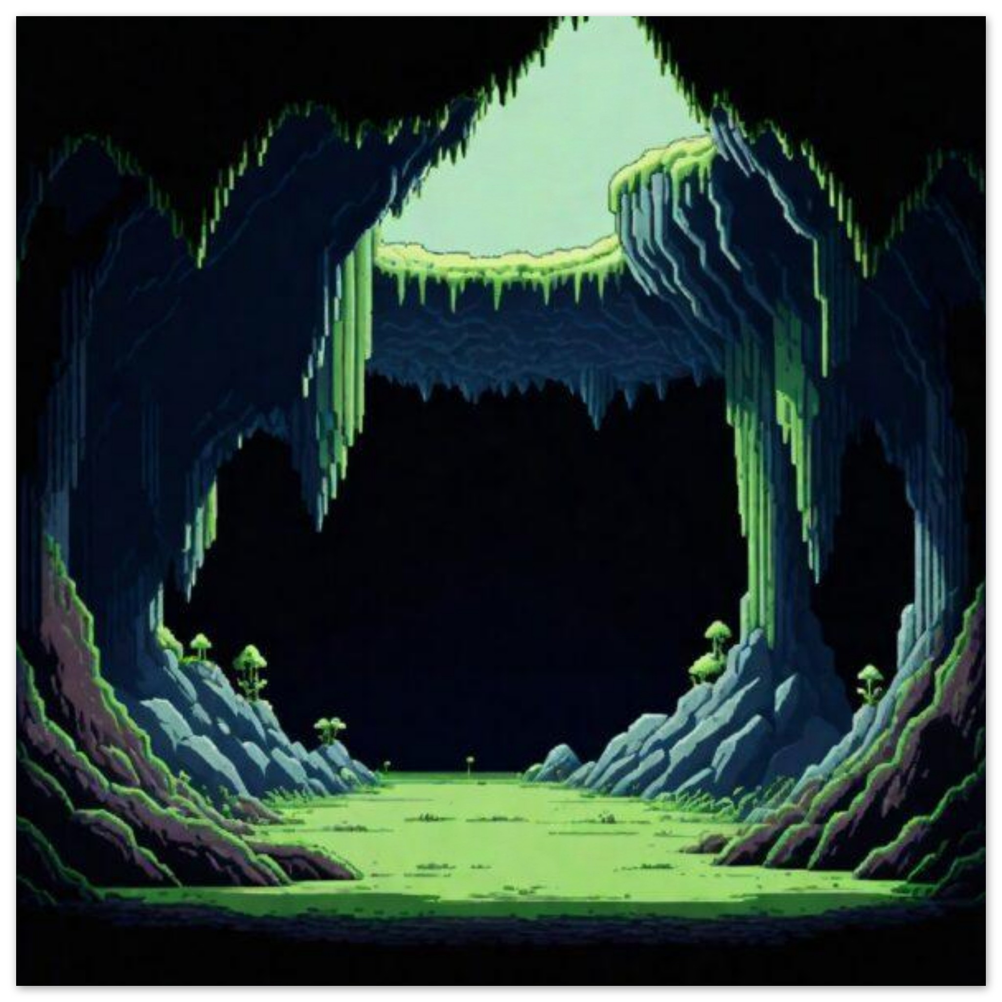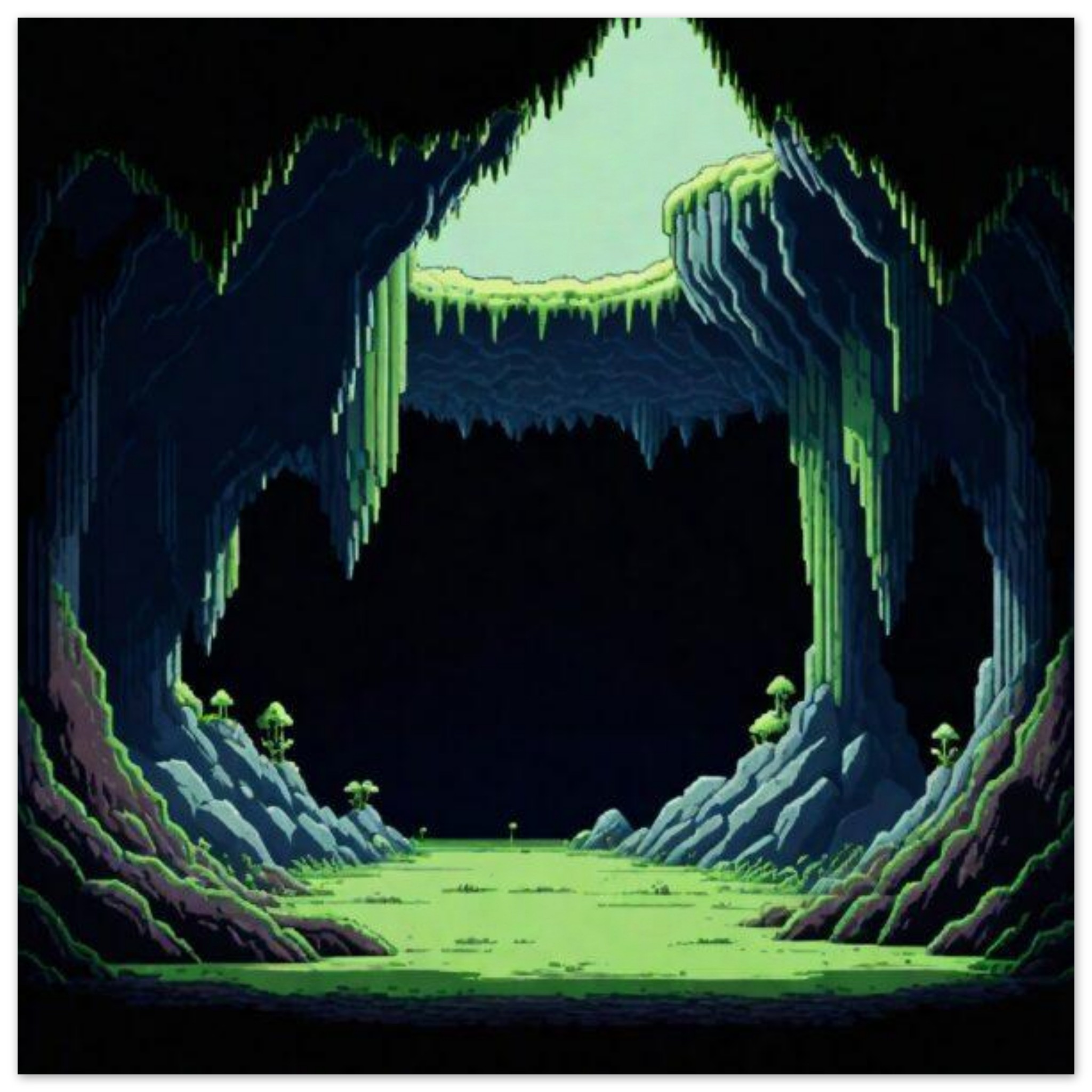 This image depicts a video game art of a cave, featuring a black background with dominant colors of black and green. The artwork showcases a cave entrance with rocks, trees, and a flag, set against a green surface. The scene evokes a sense of mystery and adventure, typical of video game environments. The overall color scheme is complemented by an accent color of 69AA22. The image does not contain any adult, racy, or gory content, making it suitable for a wide audience. The composition suggests a lush, natural setting, perfect for exploration and discovery in a virtual world.