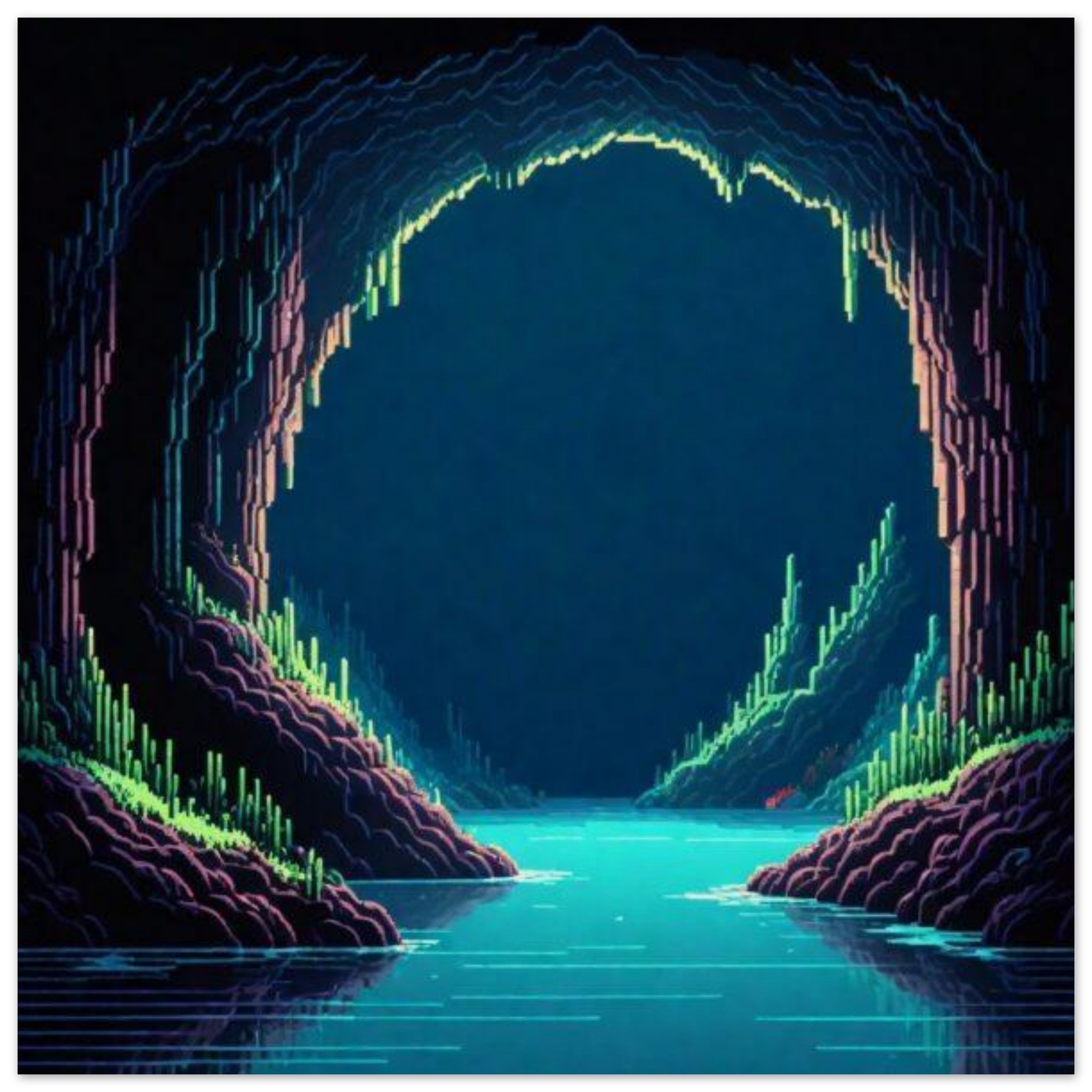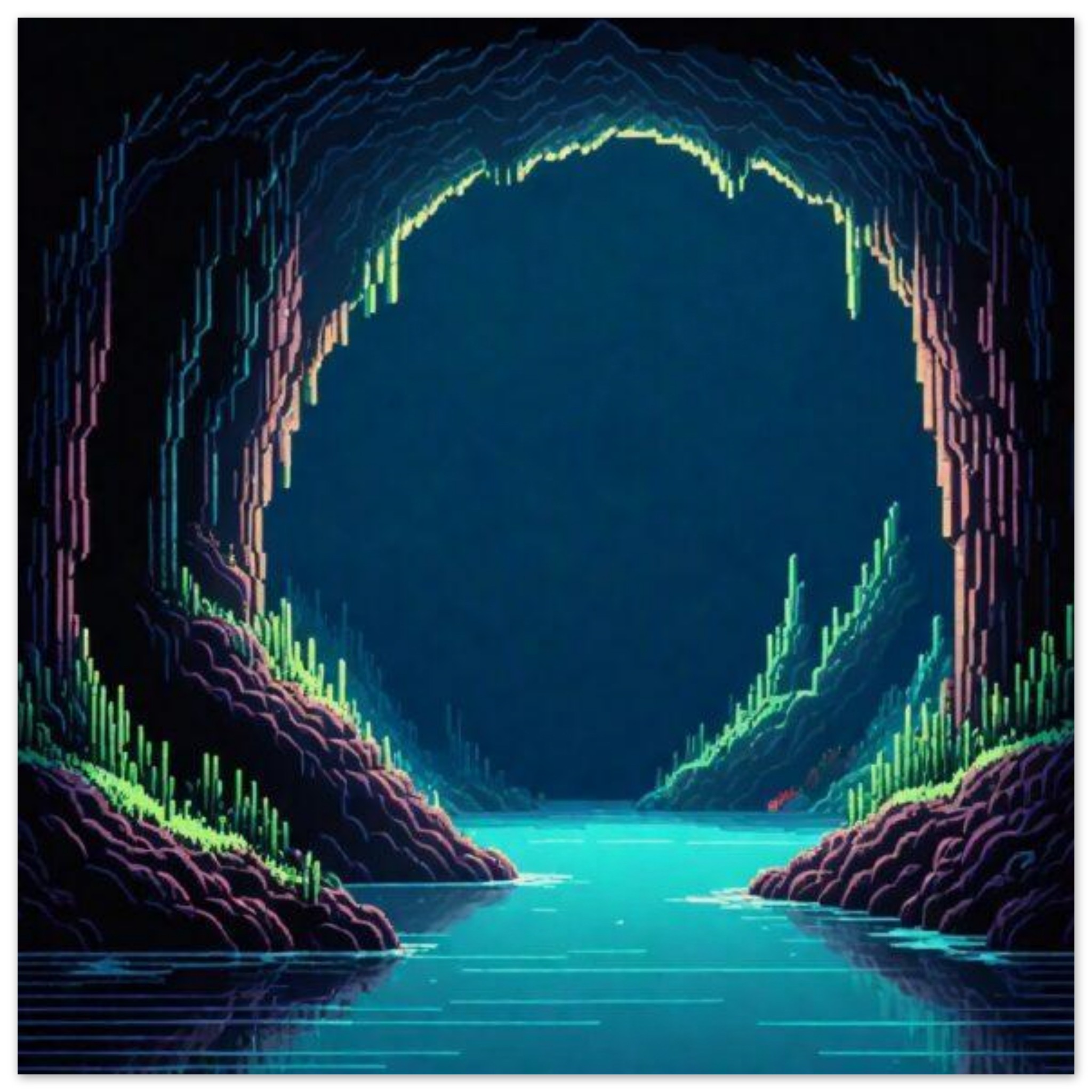 A stunning video game art depicting a cave filled with water and lush green plants. The scene is immersive, with a deep teal color dominating the foreground against a contrasting black background. The cave features intricate details, including a large hole in the middle surrounded by rocks and trees. The overall color palette is a mix of blues and greens, creating a serene and mysterious atmosphere. This artwork captures the essence of nature and adventure, making it a captivating and visually appealing virtual world for players to explore.