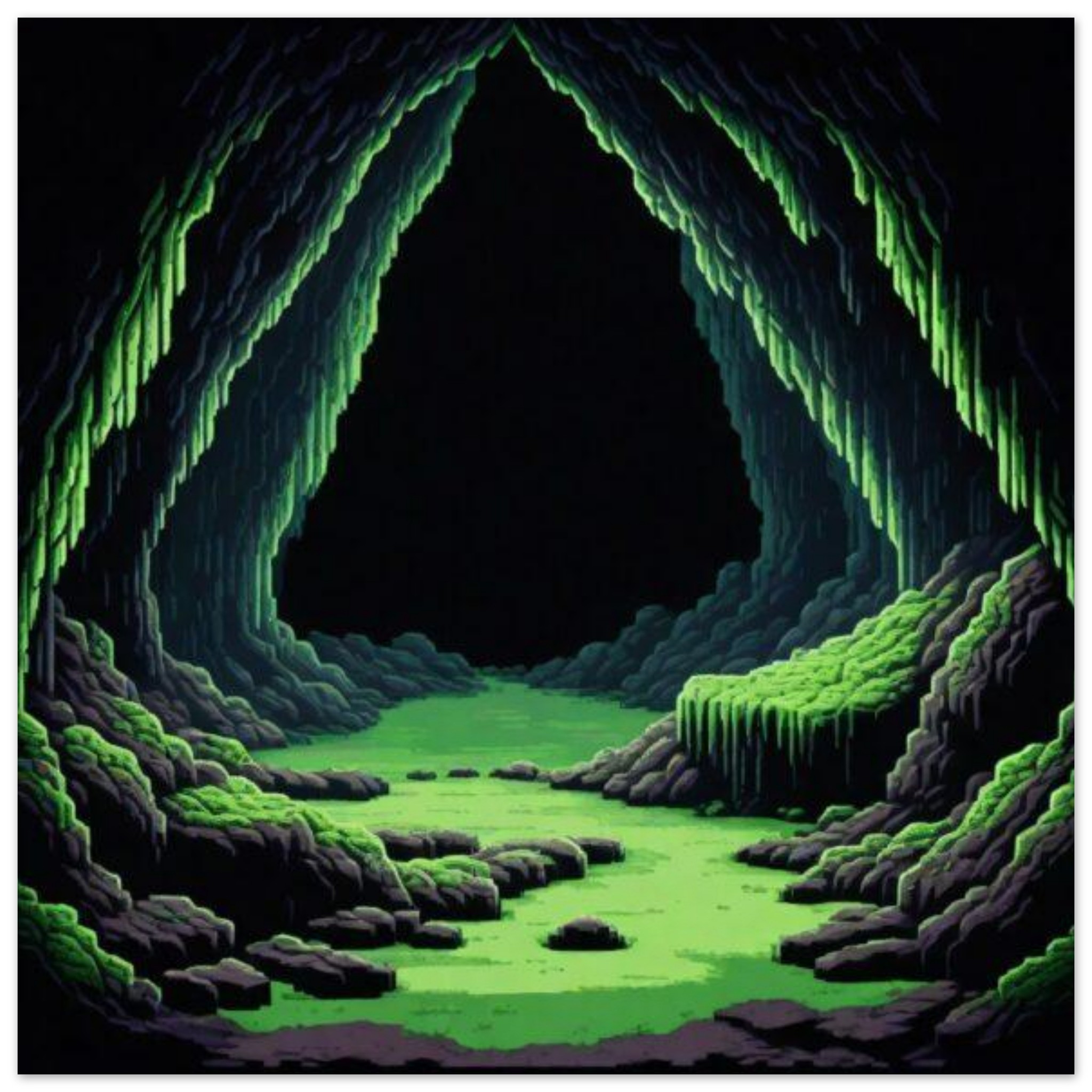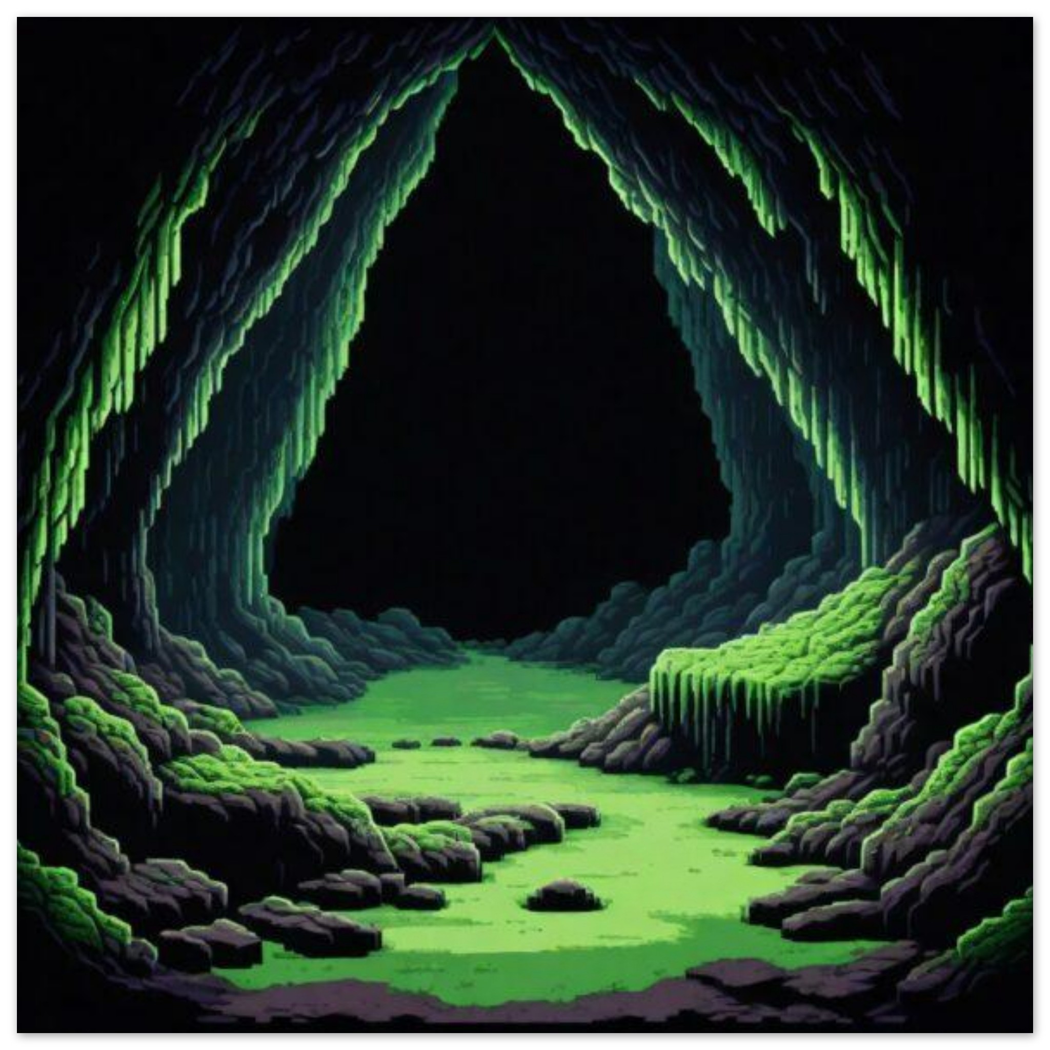This image is a video game art depicting a cave scene, with a dominant color scheme of black and green. The artwork showcases a green river surrounded by rocks and black mountain formations. The cave landscape is intricately designed, with detailed rock structures and a serene natural environment. The image evokes a sense of mystery and adventure, inviting viewers to explore the depths of the cave. The composition features a central land formation, creating a focal point for the viewer’s eye. This captivating artwork combines elements of nature and fantasy, making it a visually stimulating and immersive experience.