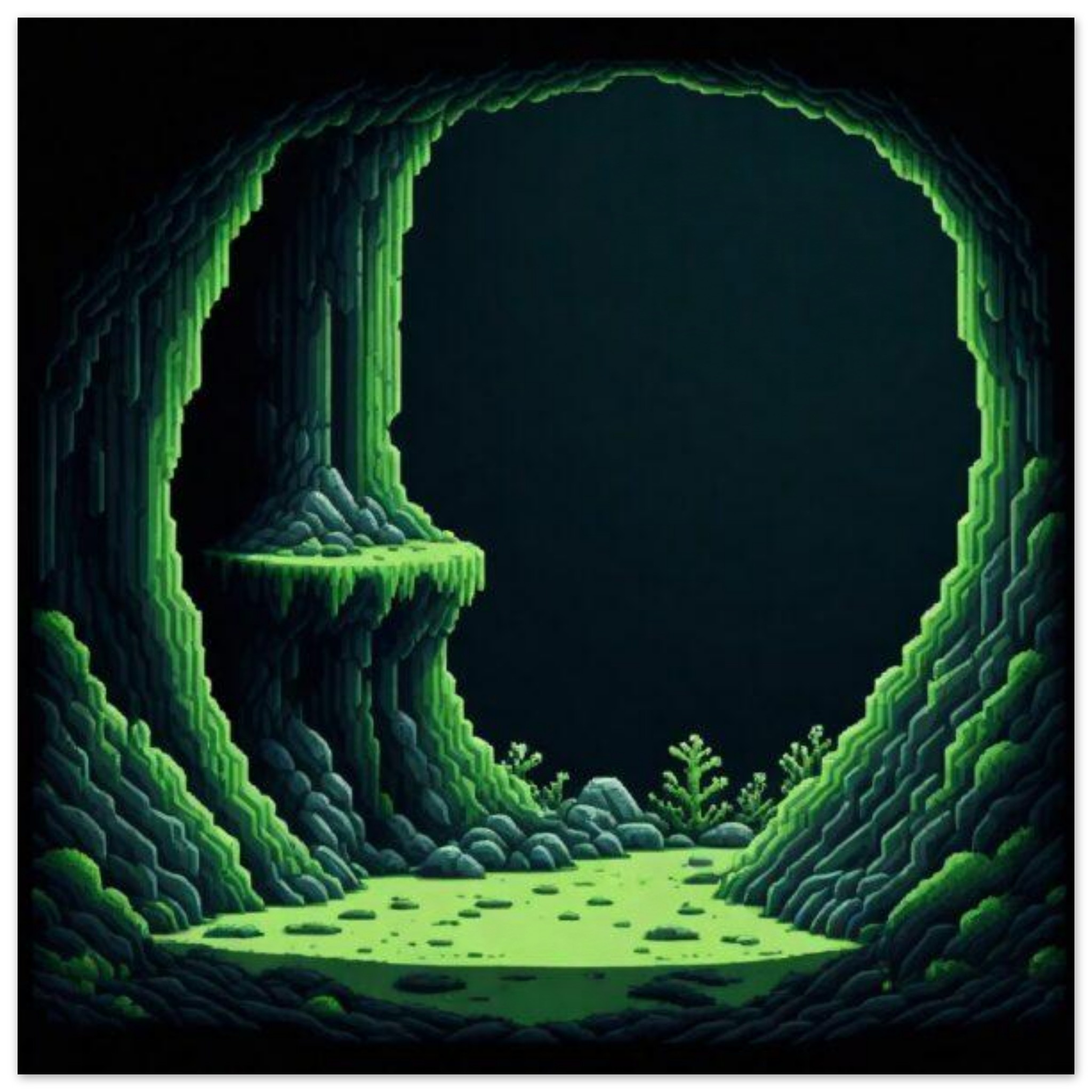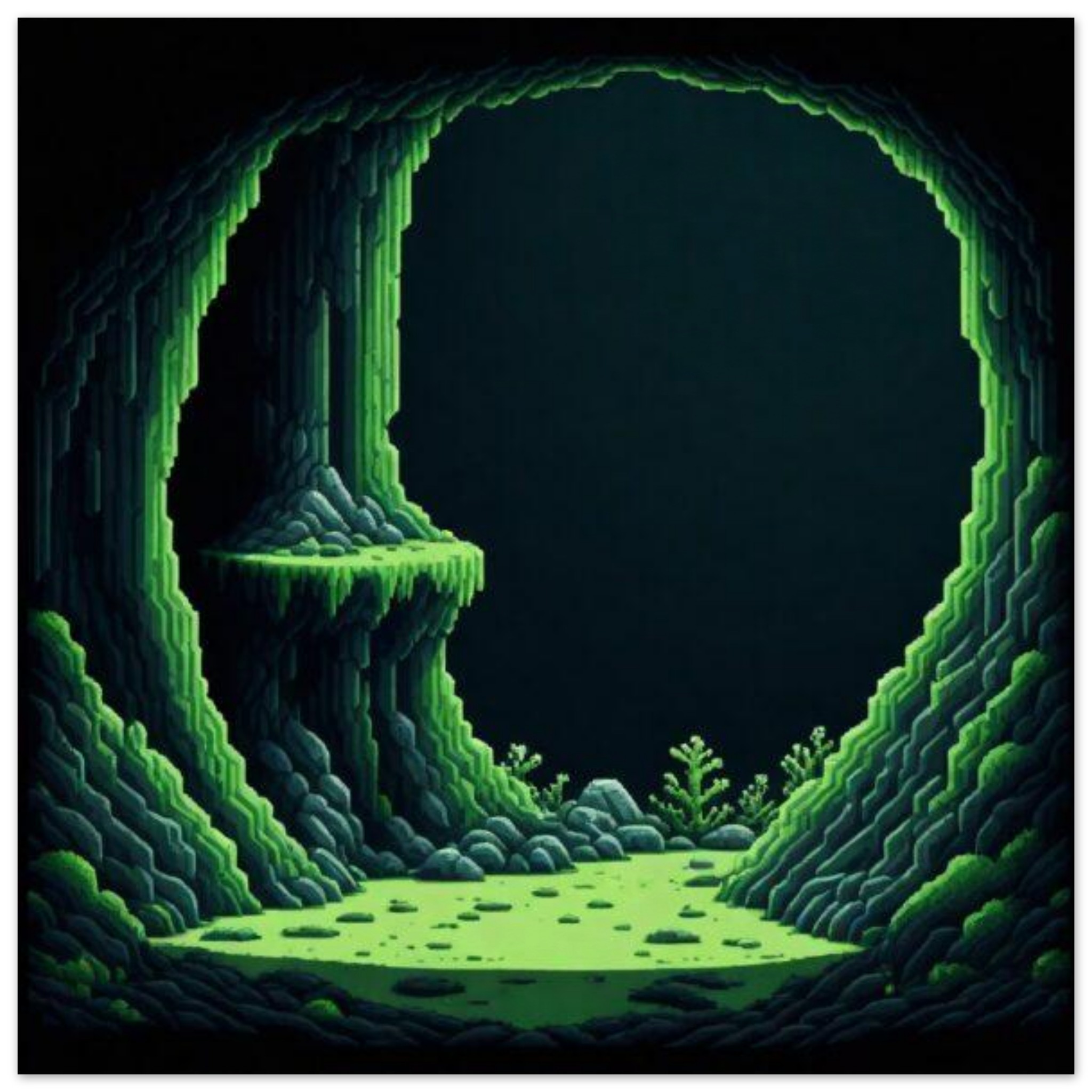 This image depicts a video game art of a cave, with a dominant color scheme of black and green. The cave is intricately designed, featuring a rocky surface and a green bush. The background is dark, enhancing the mysterious and immersive atmosphere of the scene. The artwork showcases a blend of abstract shapes and outdoor elements, creating a visually striking composition. The overall mood is one of exploration and adventure, inviting the viewer to step into the virtual world of the game. This captivating image would be a valuable addition to any dataset focused on video game art.