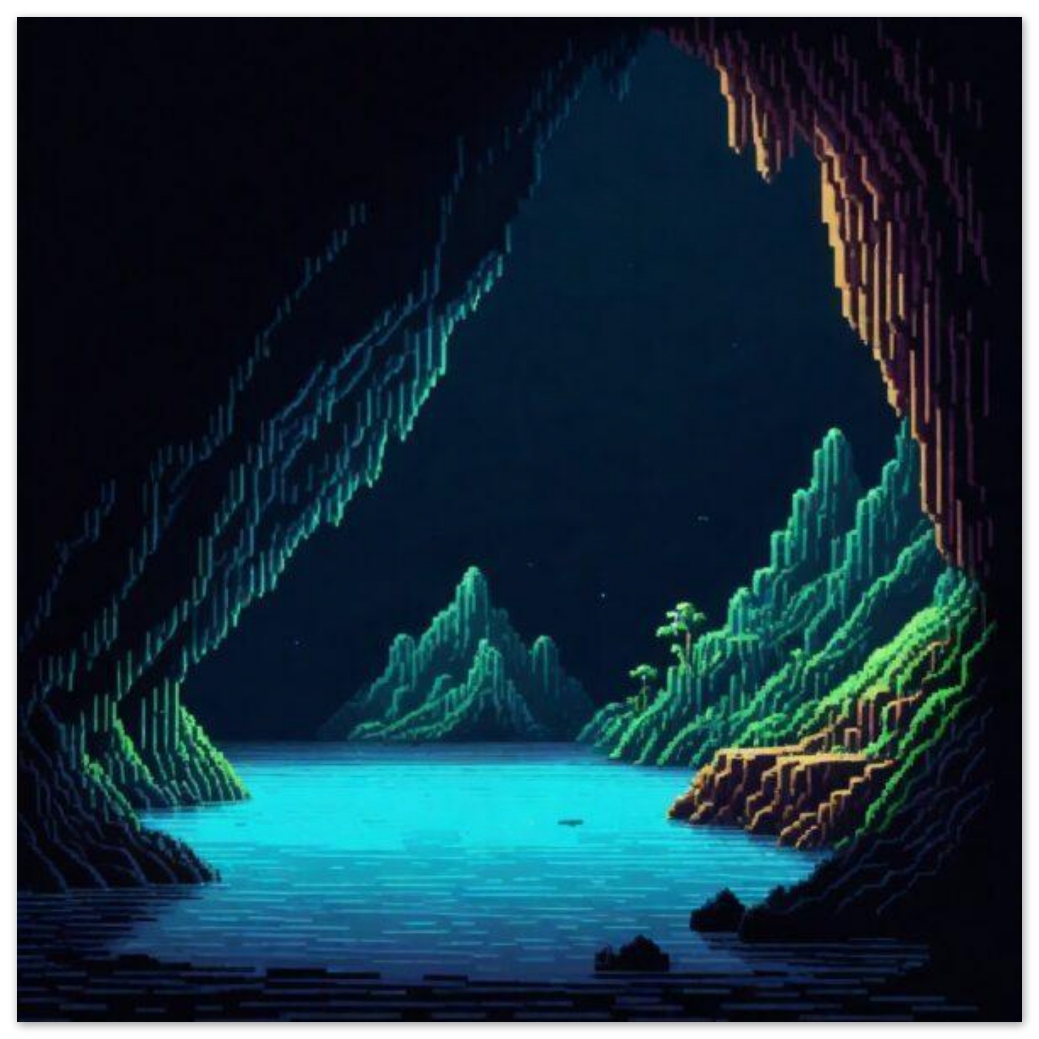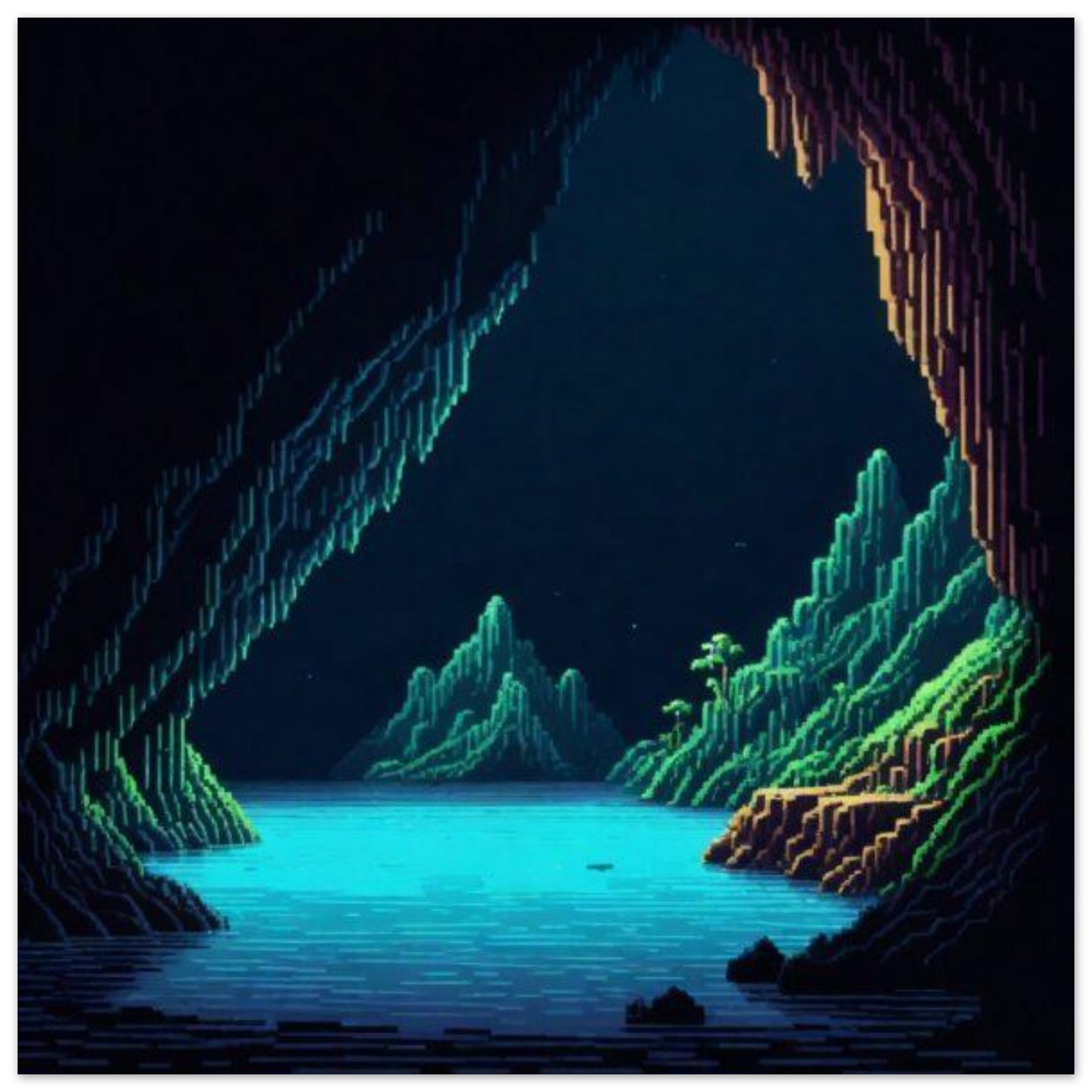 A stunning scene of a cave nestled in the mountains with a tranquil body of water in the foreground. The image showcases the beauty of nature, with the dark cave entrance contrasting against the deep blue water and the towering mountains in the distance. The dominant colors of black and blue create a sense of mystery and tranquility. The composition is peaceful and serene, evoking a sense of awe and wonder at the natural world. This picturesque landscape captures the essence of peacefulness and beauty found in untouched natural environments.