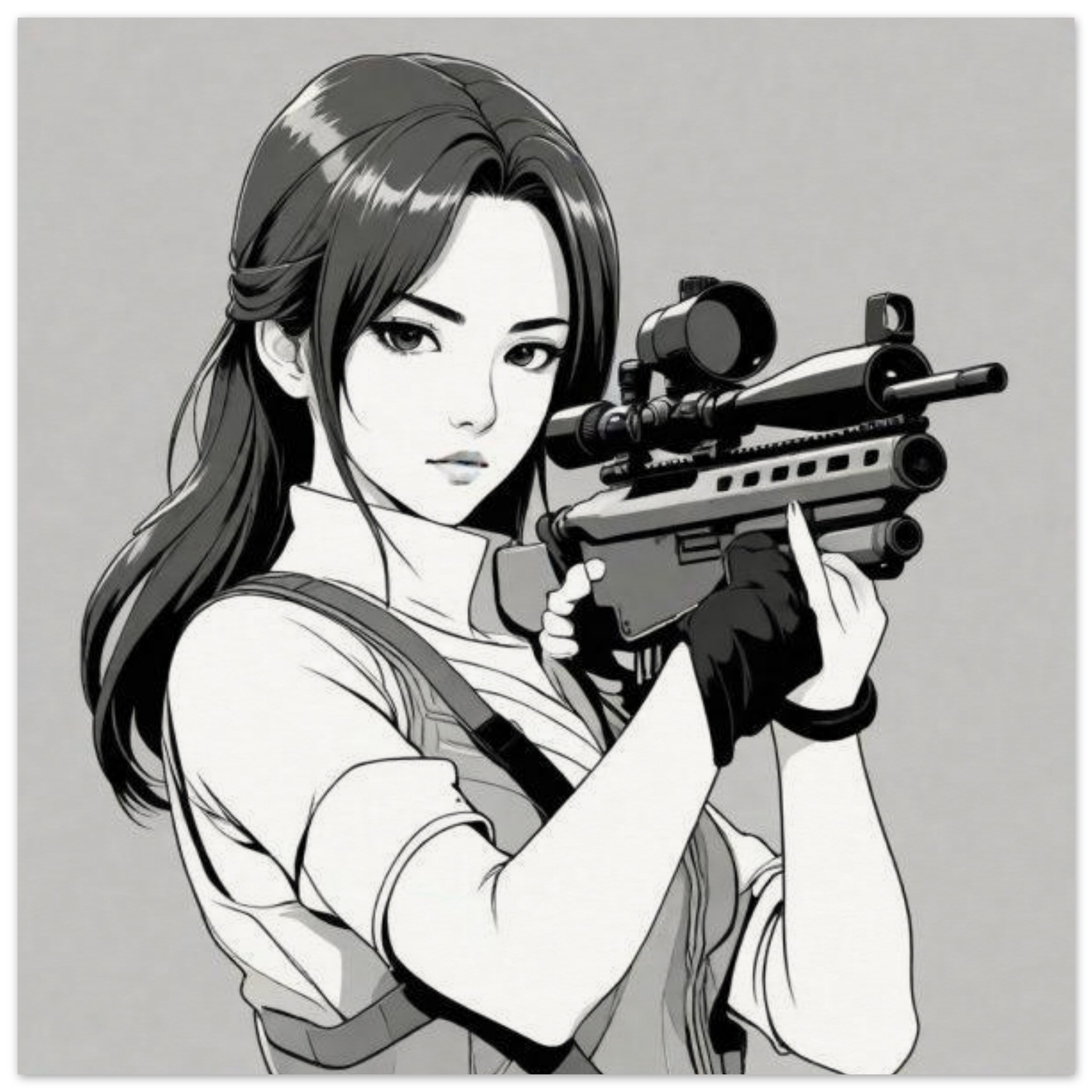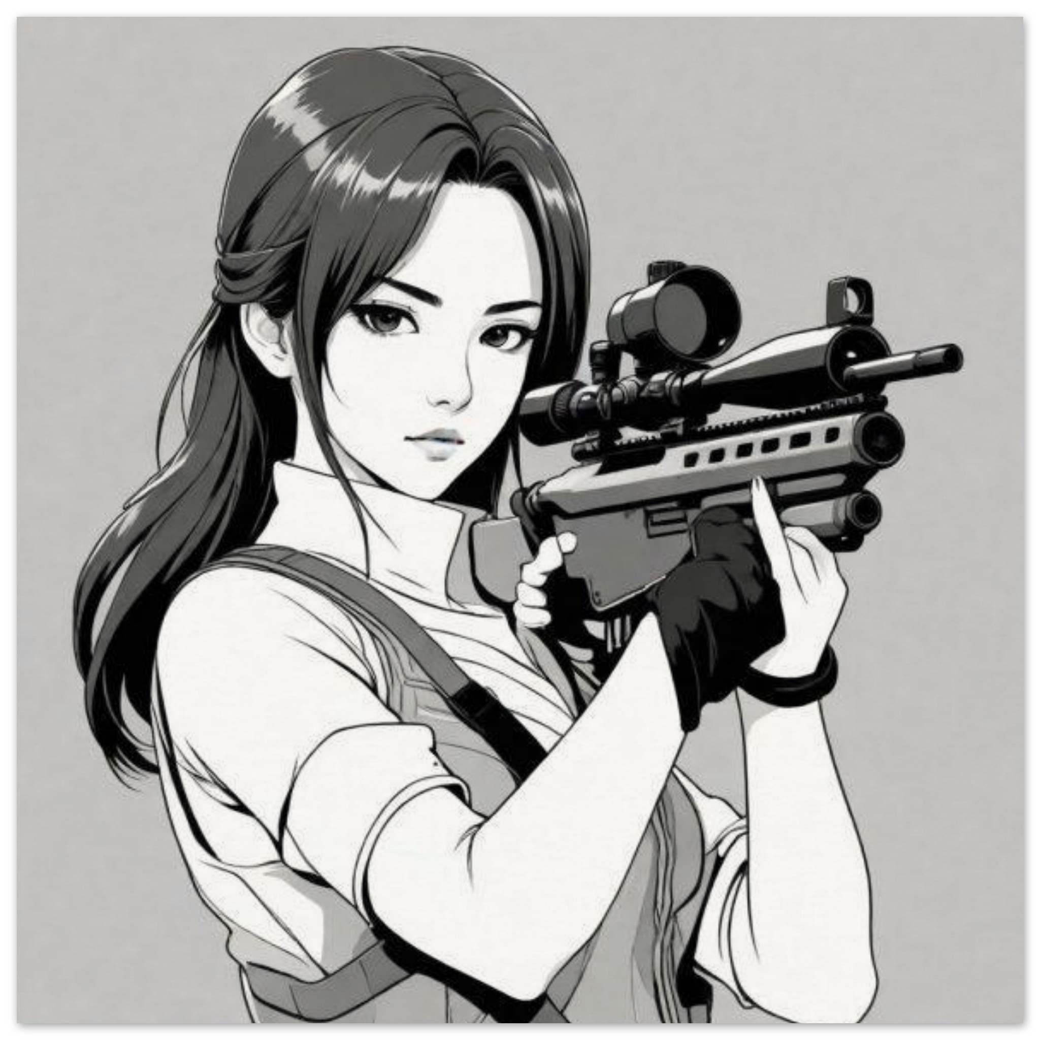 A sketch of a fictional character, a woman, holding a gun is depicted in this illustration. The image is in black and white, with the dominant colors being white and grey. The woman is positioned towards the center, with the gun held in her hand. The background is also white. The woman’s face is visible in the image, with her features showing determination. This cartoon-like image has elements of anime and animation, giving it a unique and artistic appearance. The overall composition portrays a sense of action and intensity.