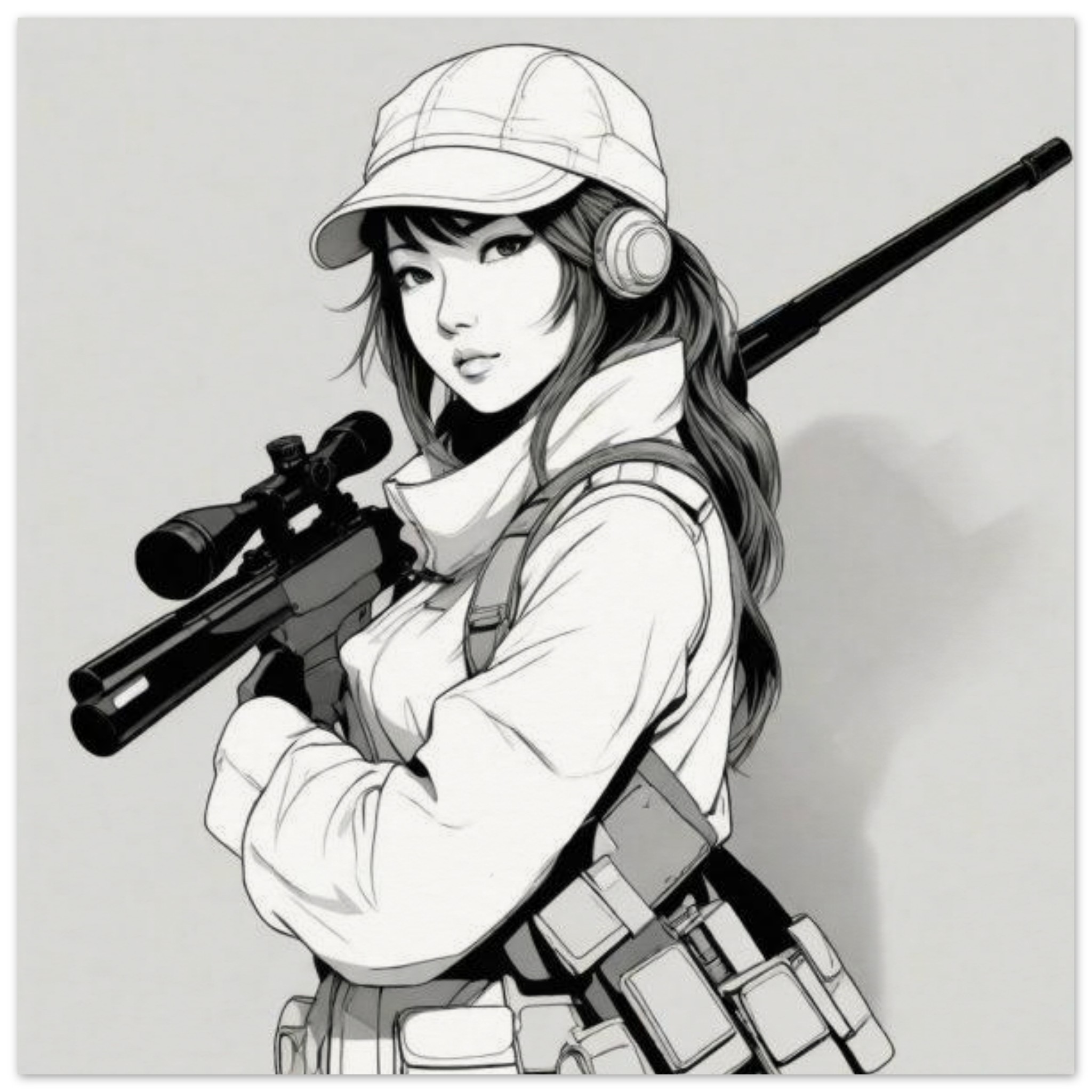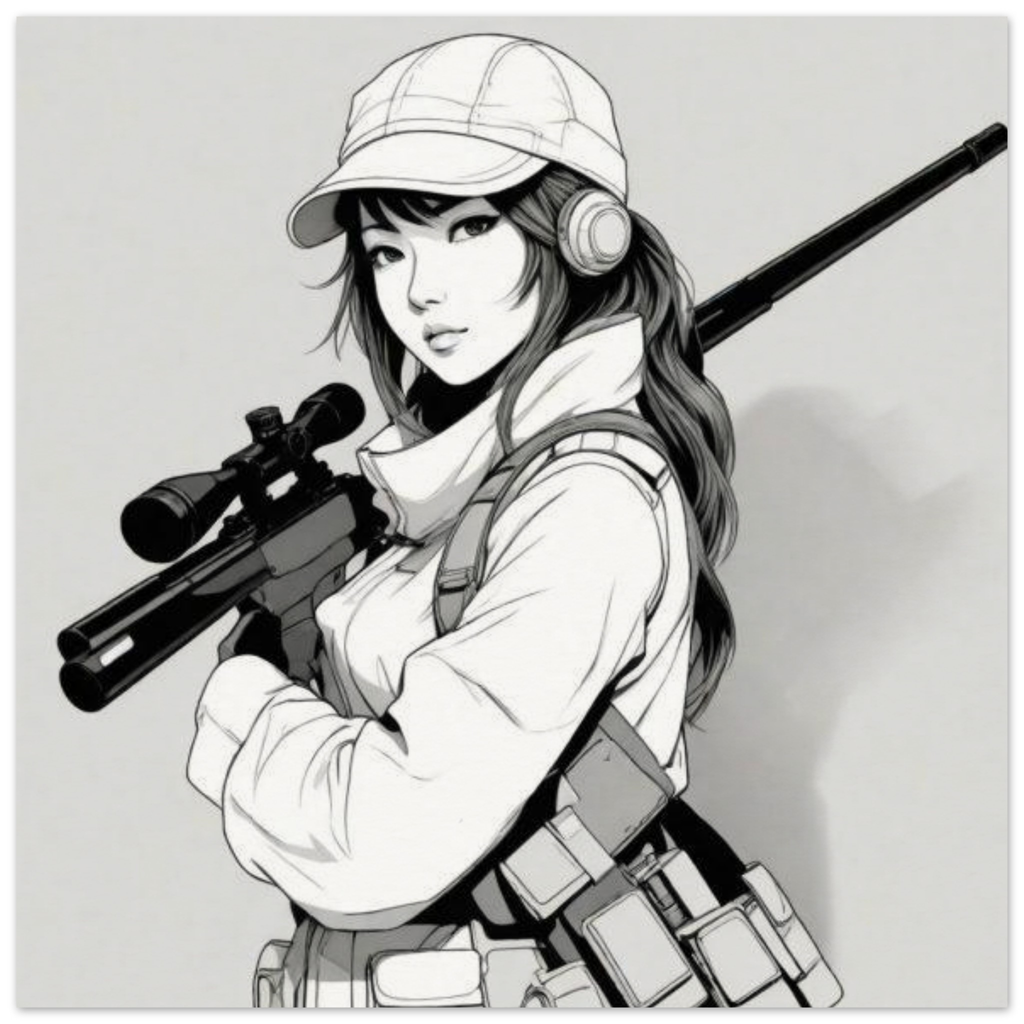A woman is depicted in a black and white image, holding a rifle in her hands. She is wearing a sun hat and is focused on the task at hand. The dominant colors in the image are white and grey, with an accent color of dark grey. The woman’s face is not clearly visible, but she appears determined. The image is categorized as abstract non-photo, with no celebrities or landmarks present. The woman’s face is partially visible in the image, indicating she may be looking towards the camera. Overall, a strong and powerful image of a woman holding a rifle.