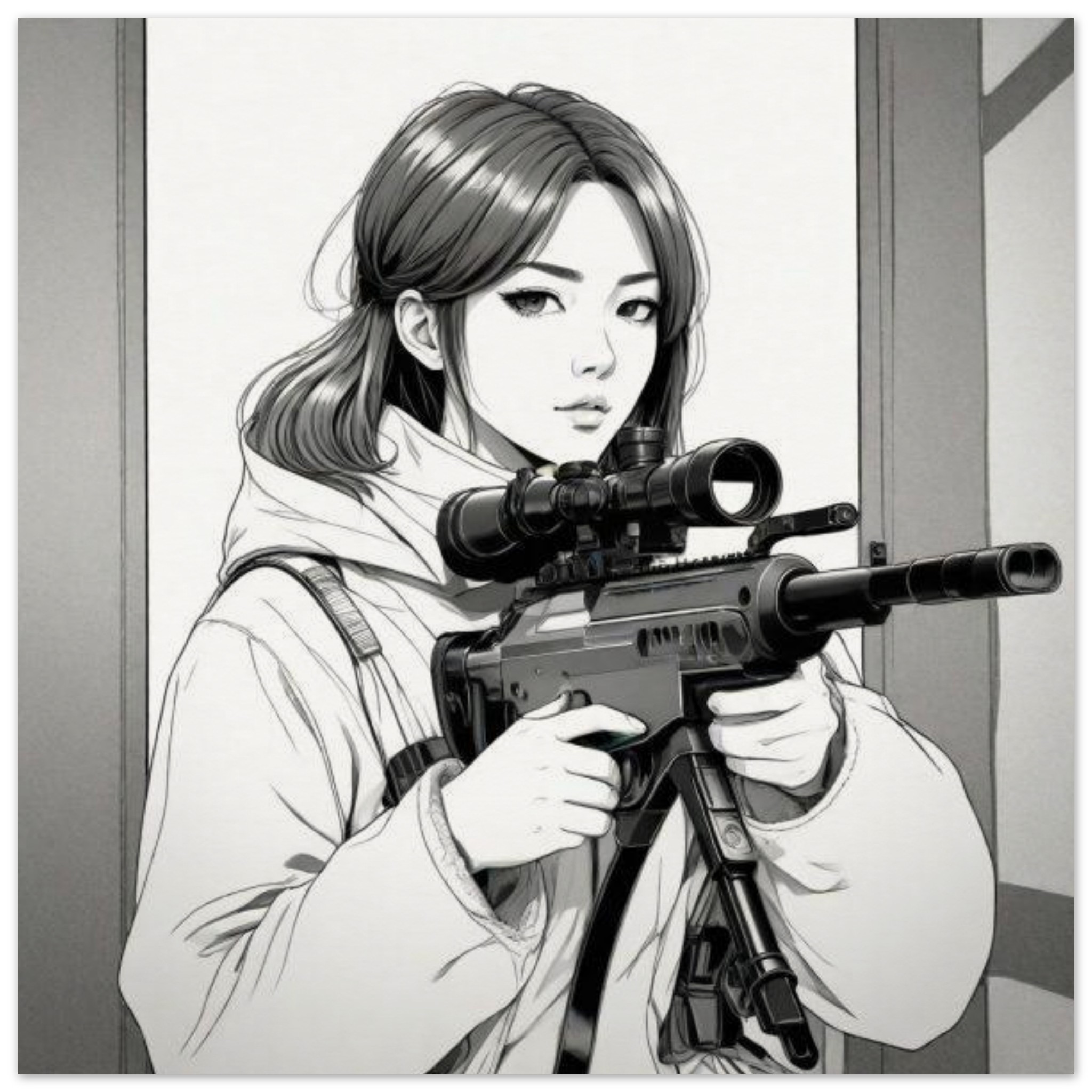 A woman with a serious expression is holding a gun in her right hand, with her finger hovering over the trigger. She is positioned slightly off-center in the image, wearing a grey shirt. The background is plain white. The woman’s face is visible and she appears focused. The dominant colors in the image are white and grey. There is also a rifle in the foreground, partially visible. The image is in black and white. The woman’s face is the main focus of the image, with a slight blur effect on the background.