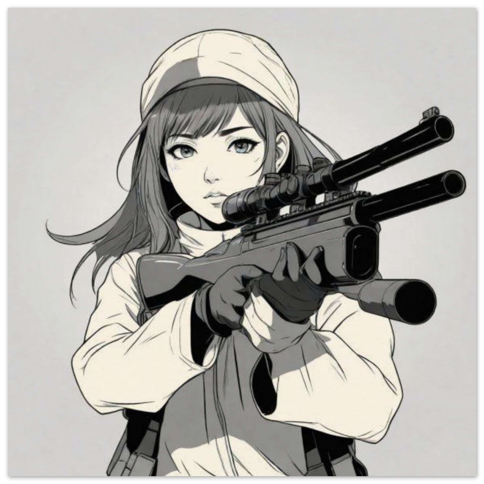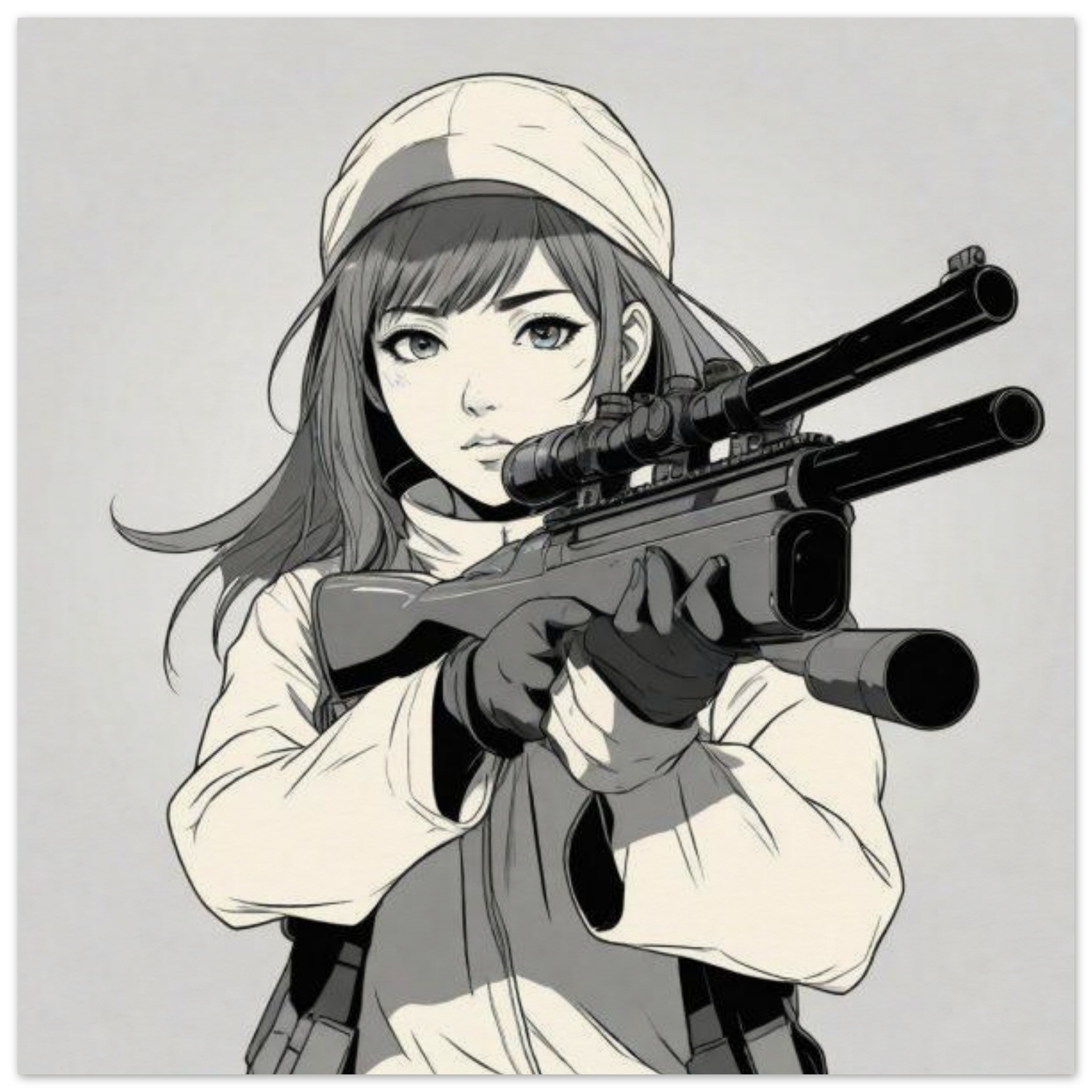 A black and white cartoon illustration of a woman holding a gun. The woman is depicted with a serious expression, wearing a simple outfit. The image has a dominant color scheme of white and grey, with an accent color of 6E675D. The artwork is in a sketch style, resembling anime with a fictional twist. The gun is prominently featured in the center of the image, with the woman positioned slightly off-center. The overall composition is dynamic and action-packed, suitable for an animation or comic book.