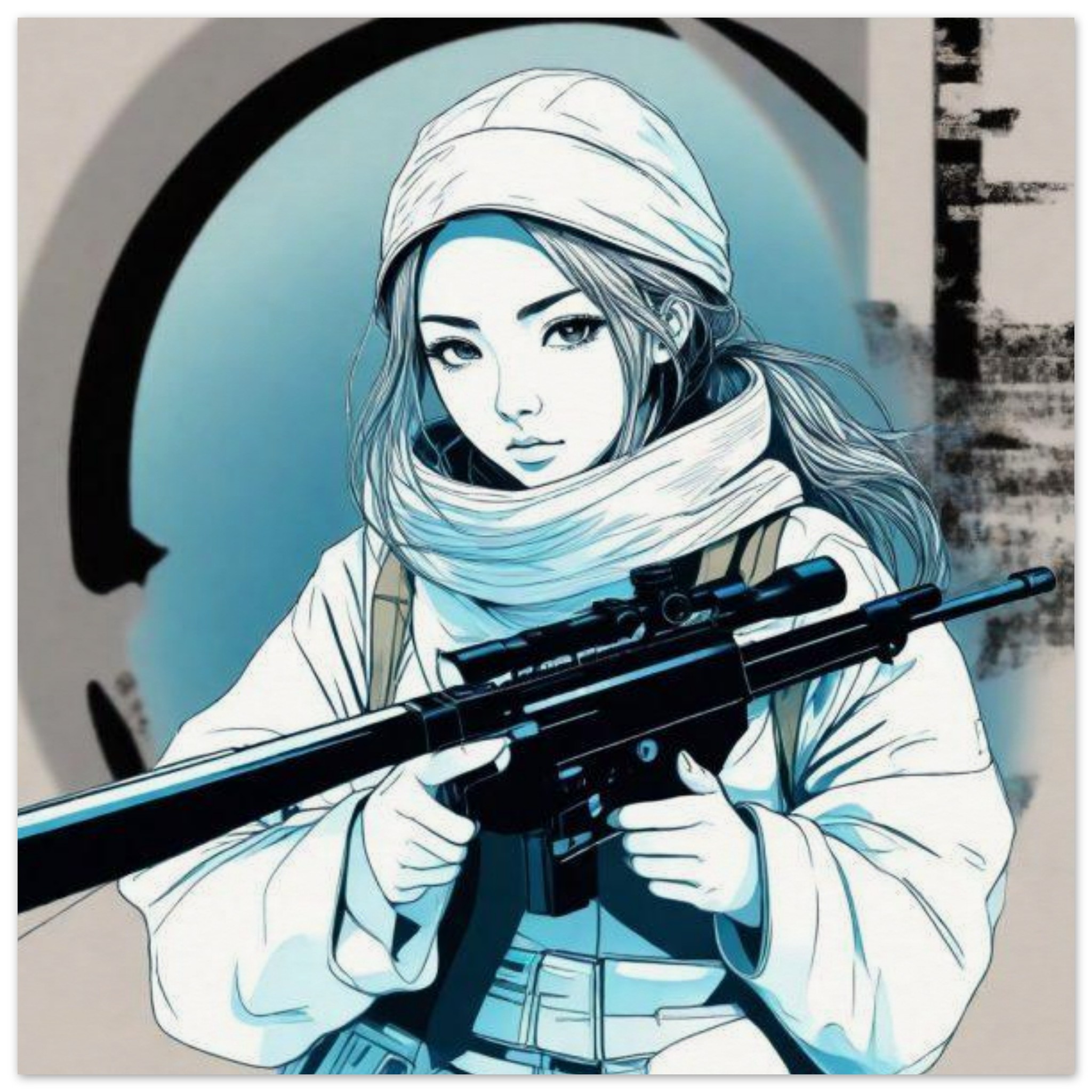 A detailed cartoon illustration of a woman holding a gun. The woman is depicted with a white human face and is wearing a black and grey outfit. The background is predominantly white. The gun she is holding is a rifle, with a dominant color of black. The drawing is done in a sketch-style, with accents of blue color. The image is not in black and white. The woman’s face is located towards the center of the image, with her eyes looking directly at the viewer. The overall tone of the image is serious and intense.
