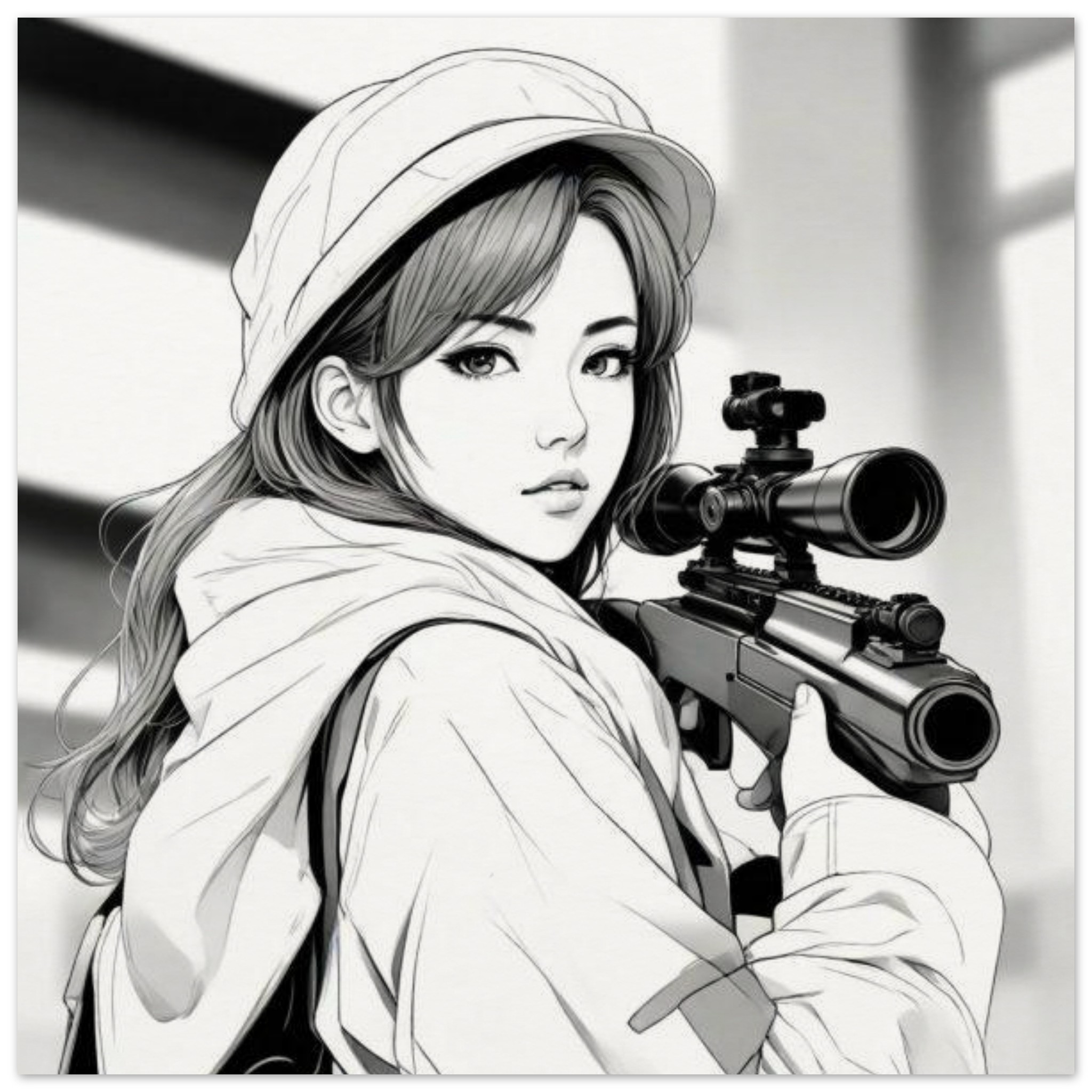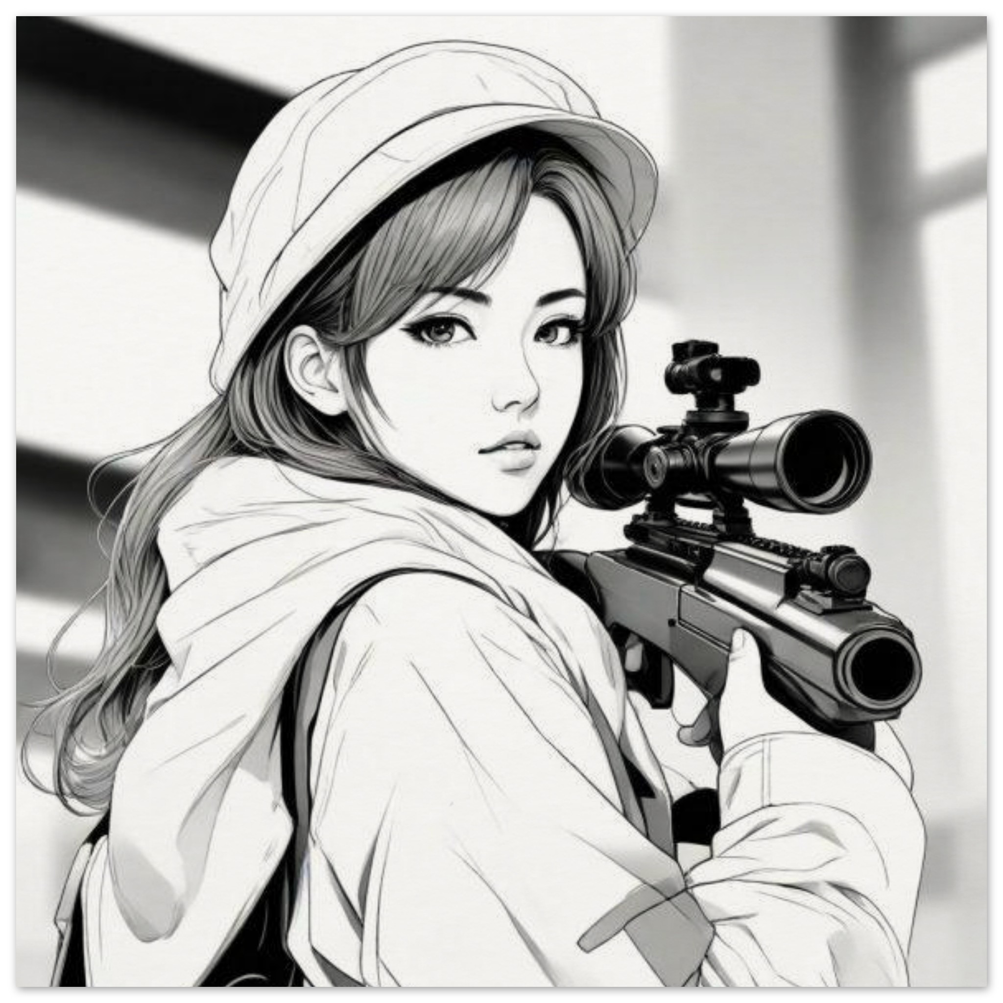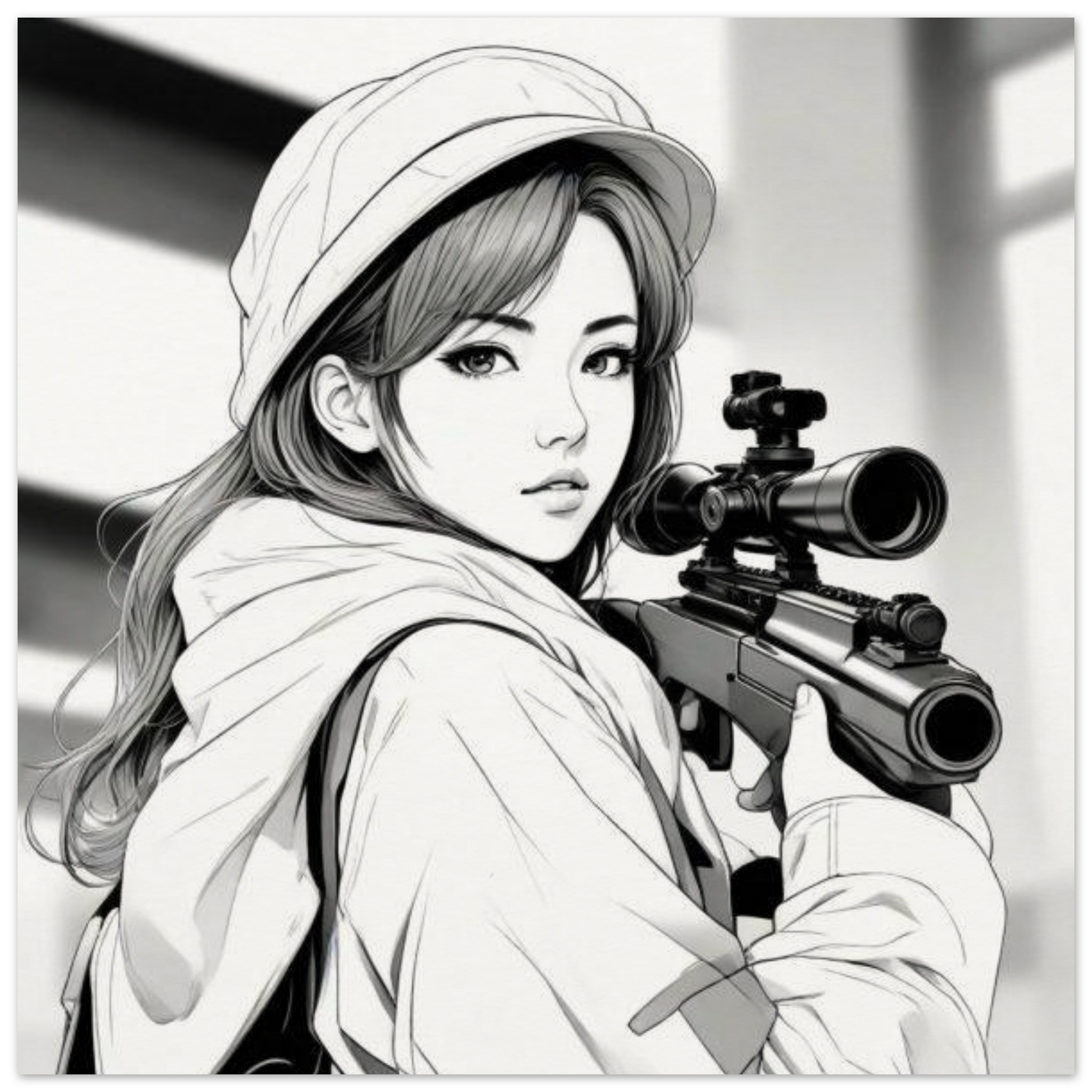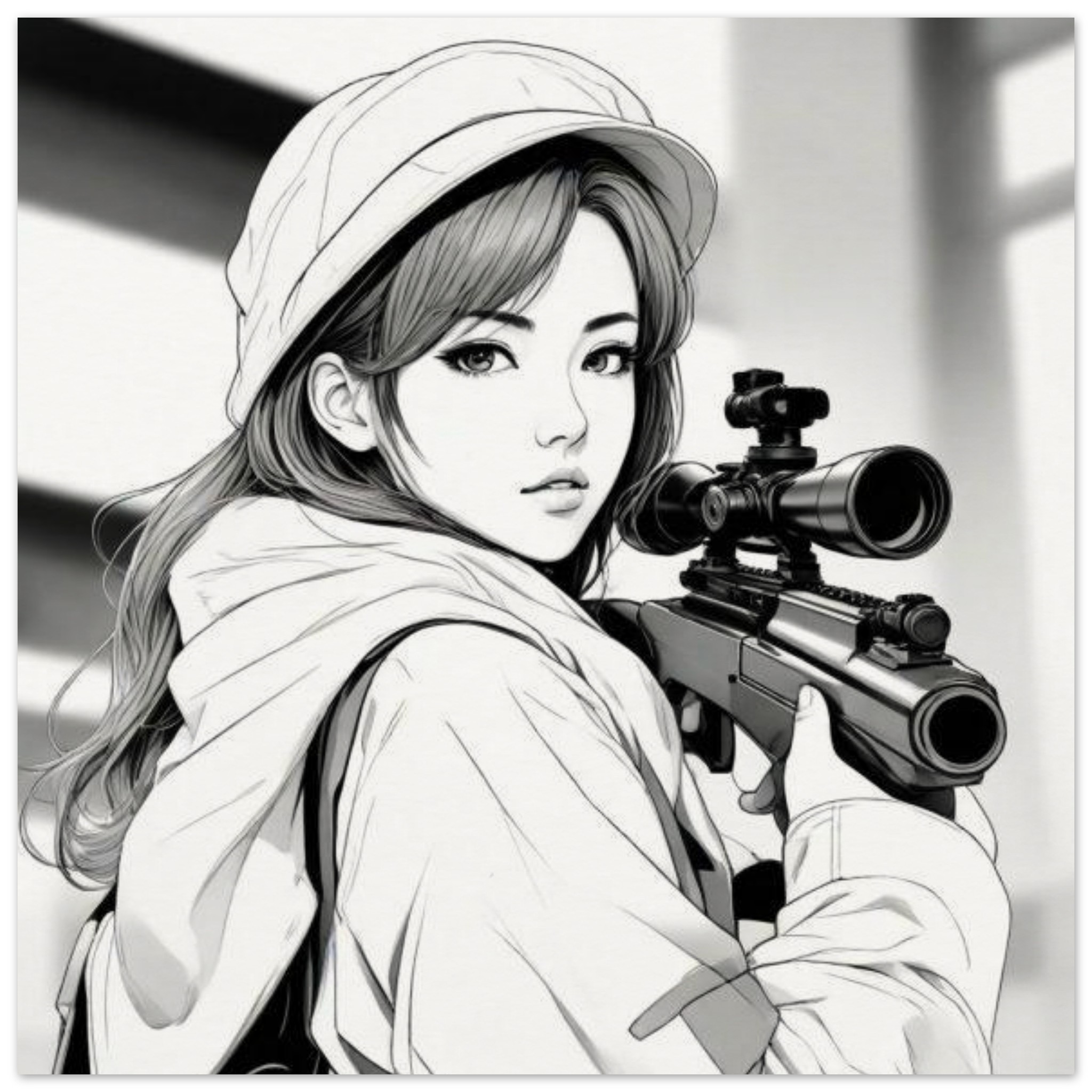 A black and white image of a woman holding a gun is depicted. The woman’s face is prominent in the center of the image, showing a serious expression. She is wearing clothing that appears to be cartoon-like or possibly anime-inspired. The dominant colors in the image are white and grey, with an accent color of dark grey. The woman is holding a gun in her hands, which is positioned towards the bottom right of the image. The overall tone of the image is intense and dramatic, with a focus on the woman’s determined expression and the gun she is holding.