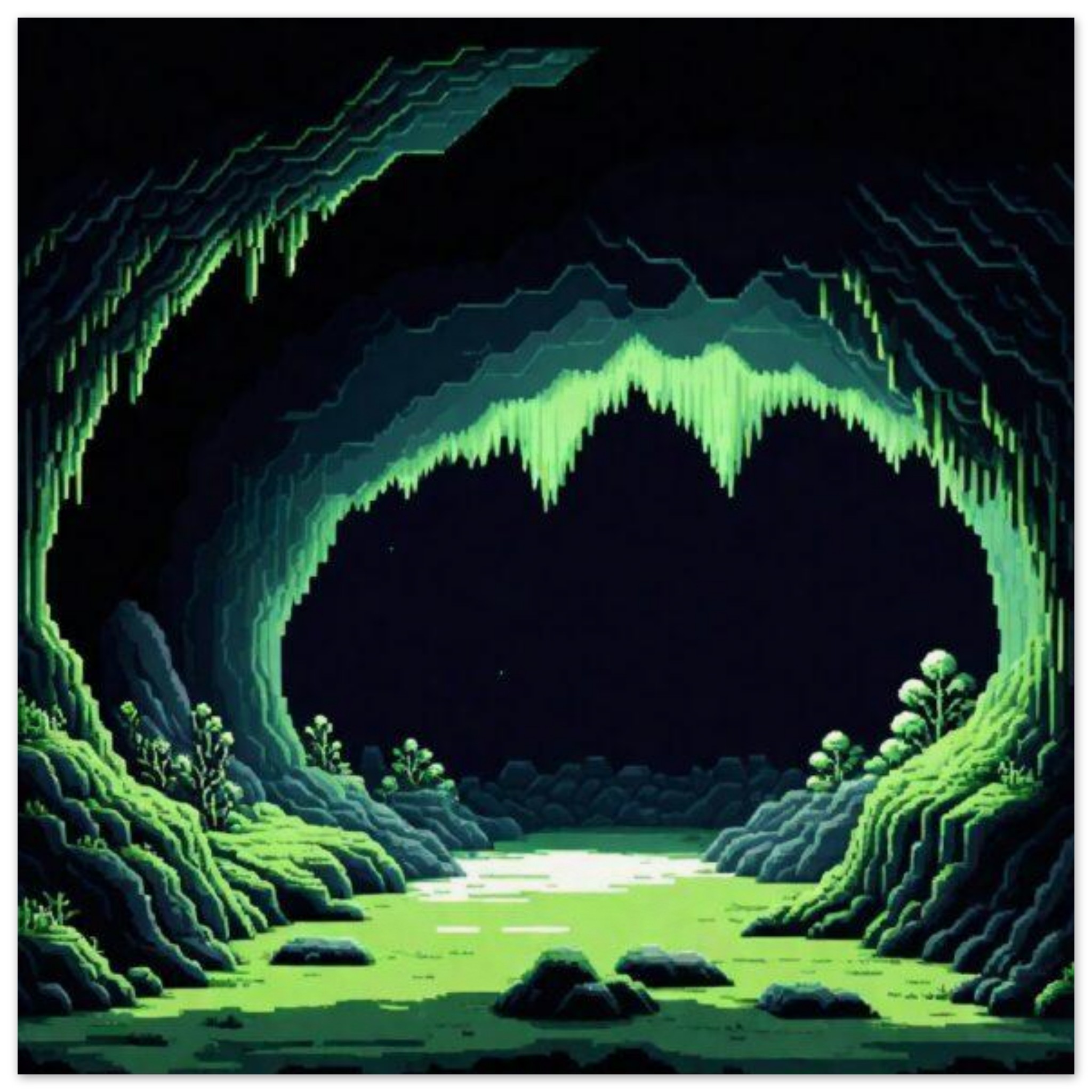 This image is a video game art depicting a dark and mysterious cave environment. The scene features intricate pixelated details of rocky cliffs, a serene body of water, and lush green vegetation. The dominant colors are black and green, creating a sense of depth and contrast. The accent color is a vibrant shade of green. The image exudes a sense of adventure and exploration, inviting the viewer to immerse themselves in this digital world. This captivating screenshot showcases the beauty of nature within a virtual realm, making it a visually stunning piece of video game art.