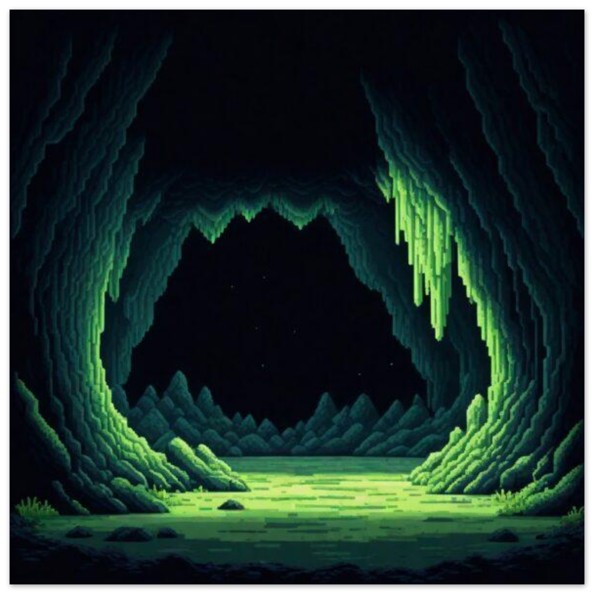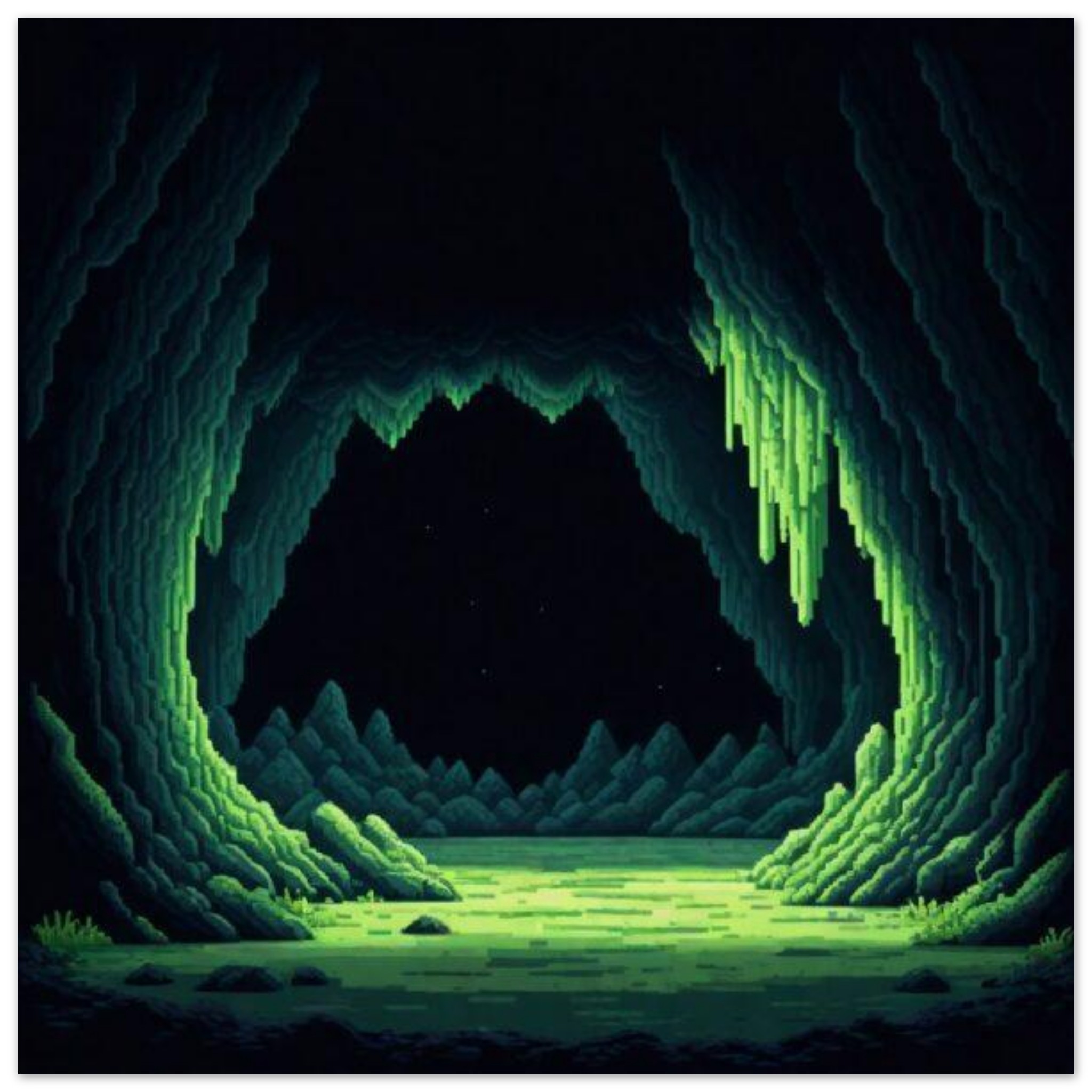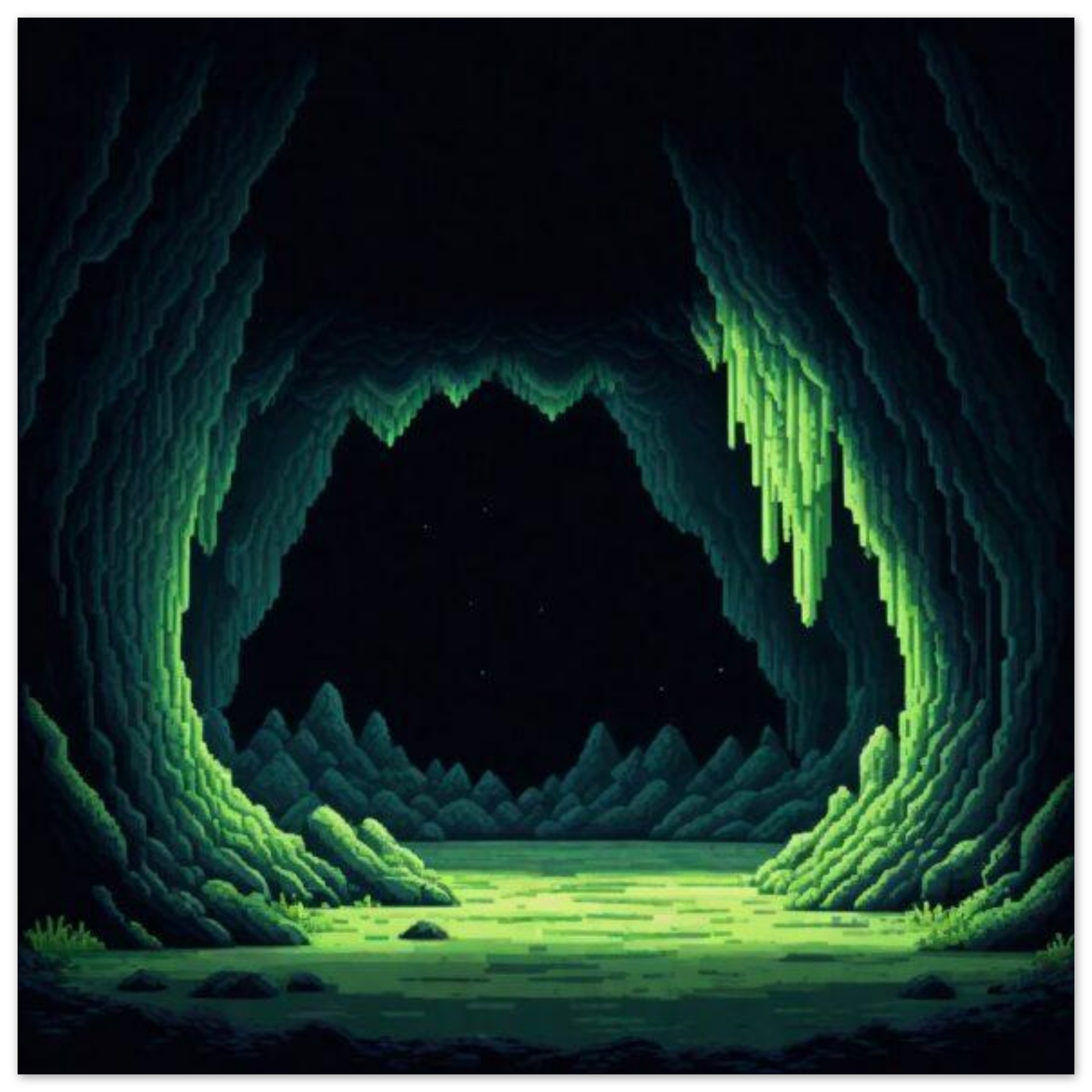 A breathtaking video game art depicting a mysterious cave filled with green water, trees, and bushes. The scene showcases a captivating contrast of black background with vibrant green colors. The image features intricate details like icicles hanging from the ceiling, creating a sense of wonder and exploration. The composition is centered around a vast landmass in the foreground, emphasizing the scale and depth of the cave. This immersive screenshot captures the essence of a virtual world, inviting viewers to delve into an adventure filled with natural beauty and intrigue.