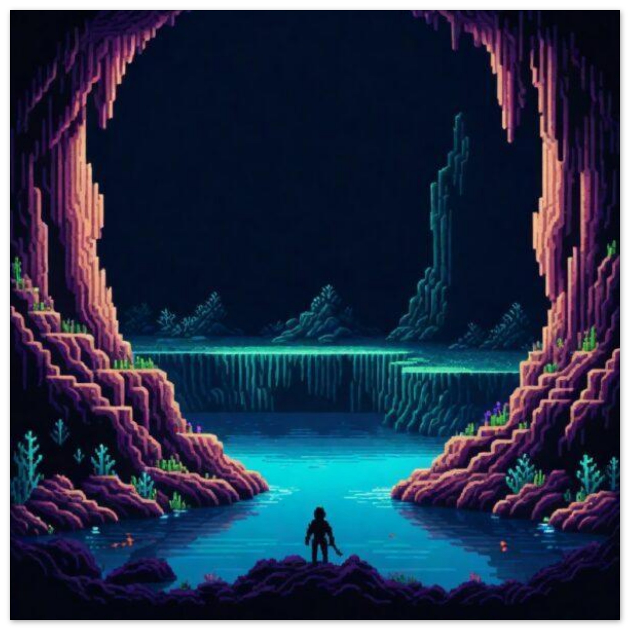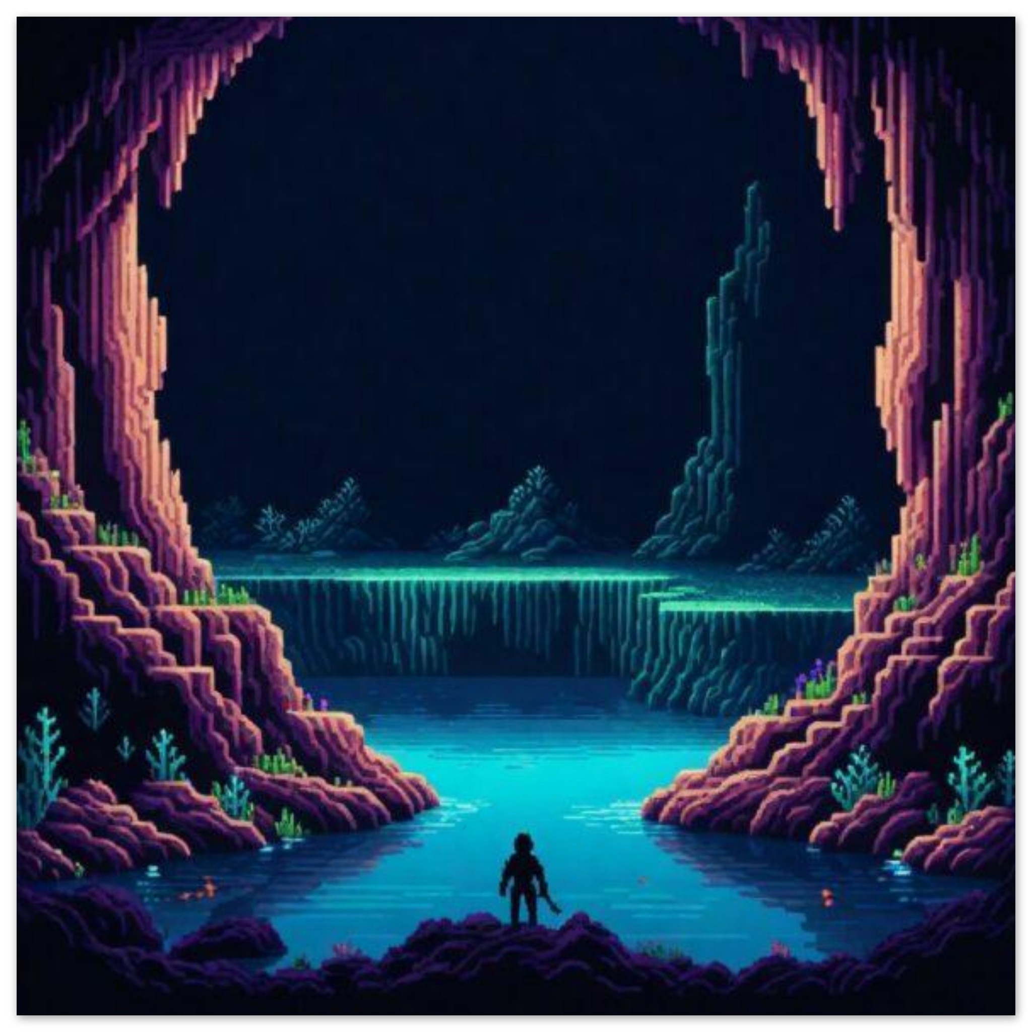 A captivating video game scene showcasing a mysterious cave with a majestic waterfall cascading down into a serene pool of water. In the foreground, a solitary figure stands, gazing out at the natural wonder before them. The cave is shrouded in darkness, with hints of light illuminating the rocky walls. The atmosphere is both tranquil and awe-inspiring, inviting the viewer to explore the hidden depths of this virtual world. The color palette is dominated by shades of black, with a striking accent of blue adding a touch of intrigue to the scene.