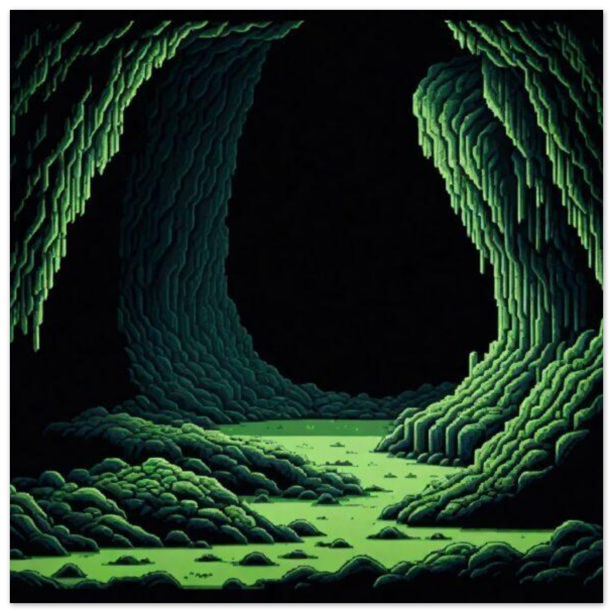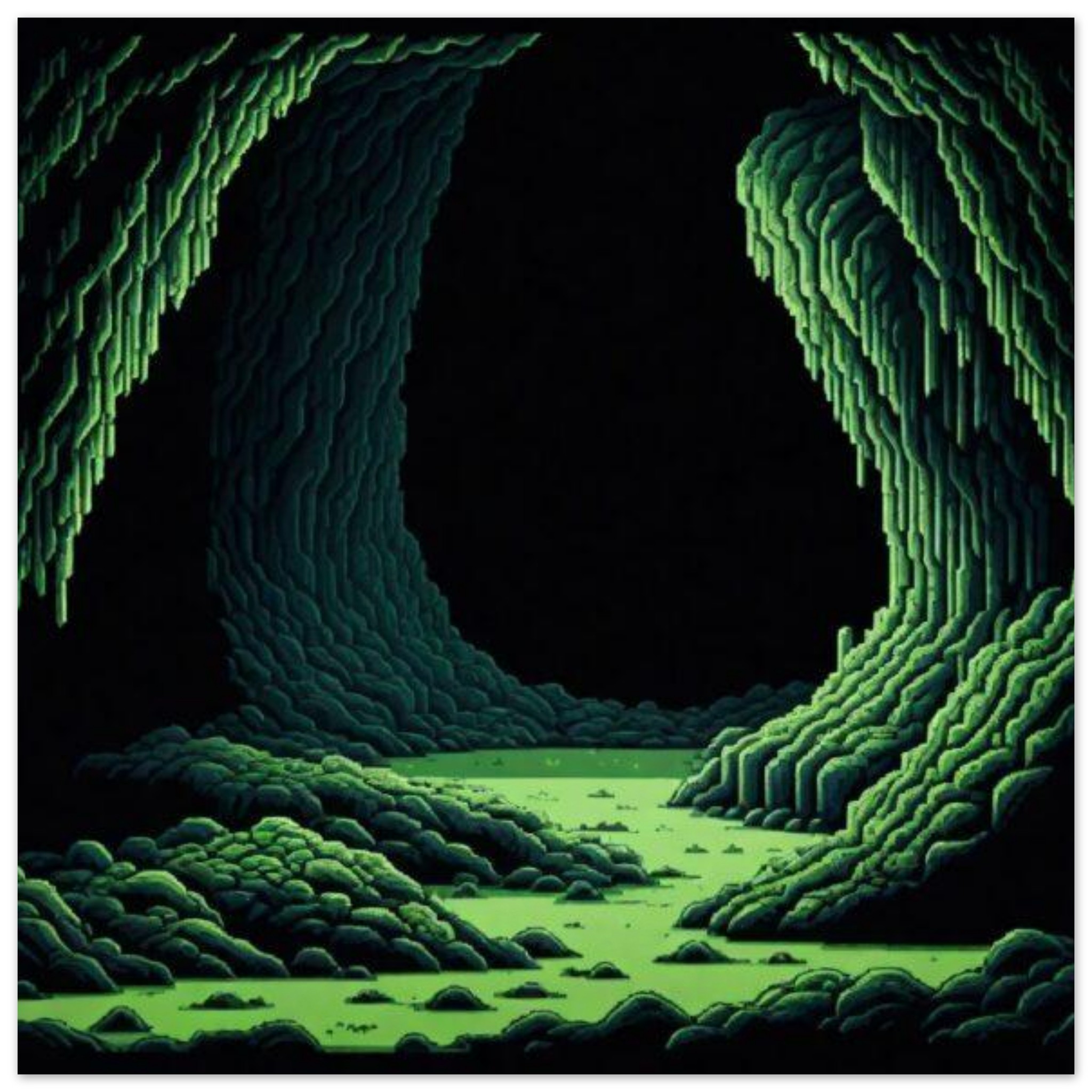 A stunning video game art piece depicting a mysterious cave, with a dominant color scheme of black and green. The image showcases a vibrant green river flowing through the cave, surrounded by rocks and lush plant life. The intricate details of the green lines on the black background create a mesmerizing and immersive atmosphere. The foreground features a large plant with leaves, adding to the natural and wild aesthetic of the scene. This captivating artwork perfectly captures the beauty and wonder of nature, inviting viewers to explore the depths of the virtual cave environment.
