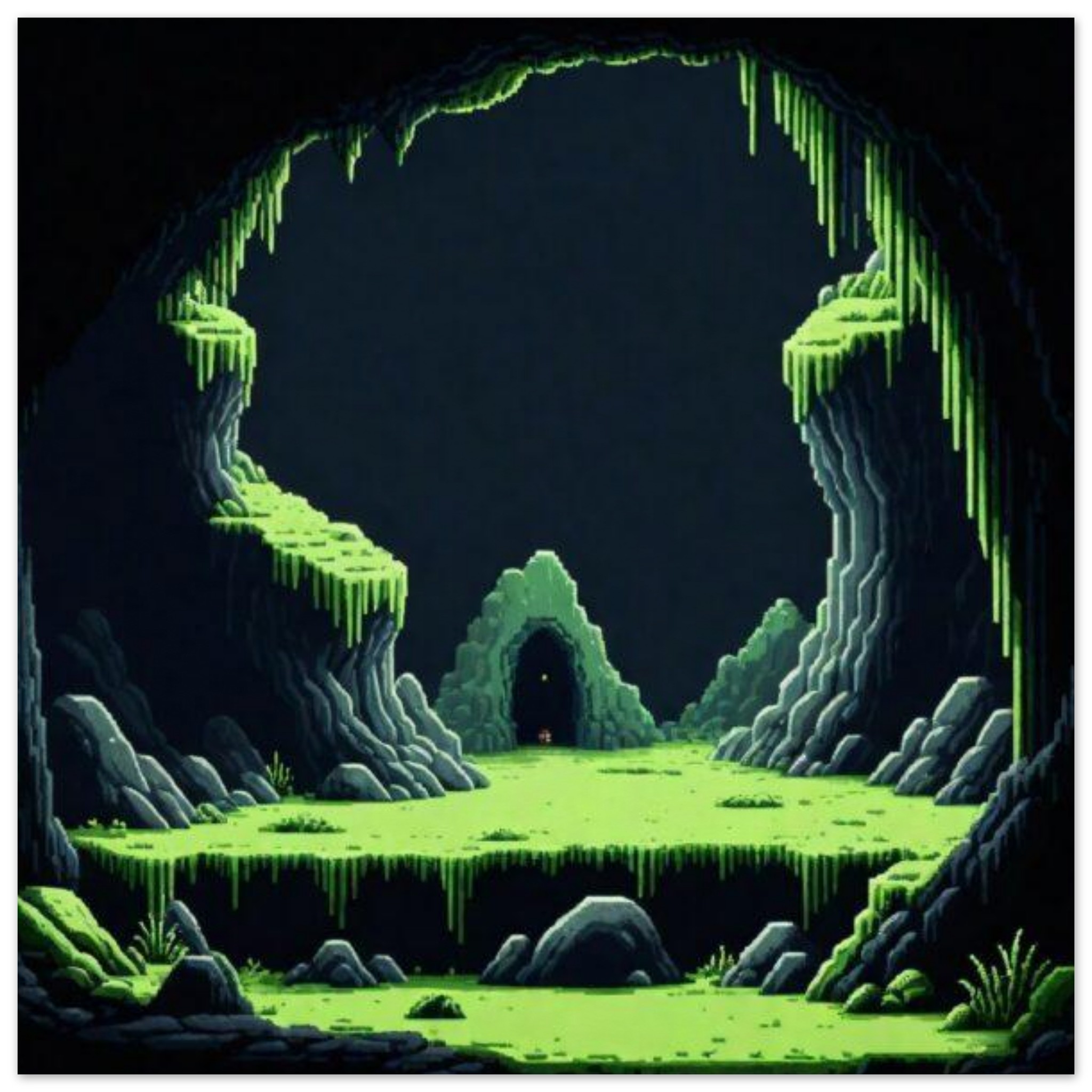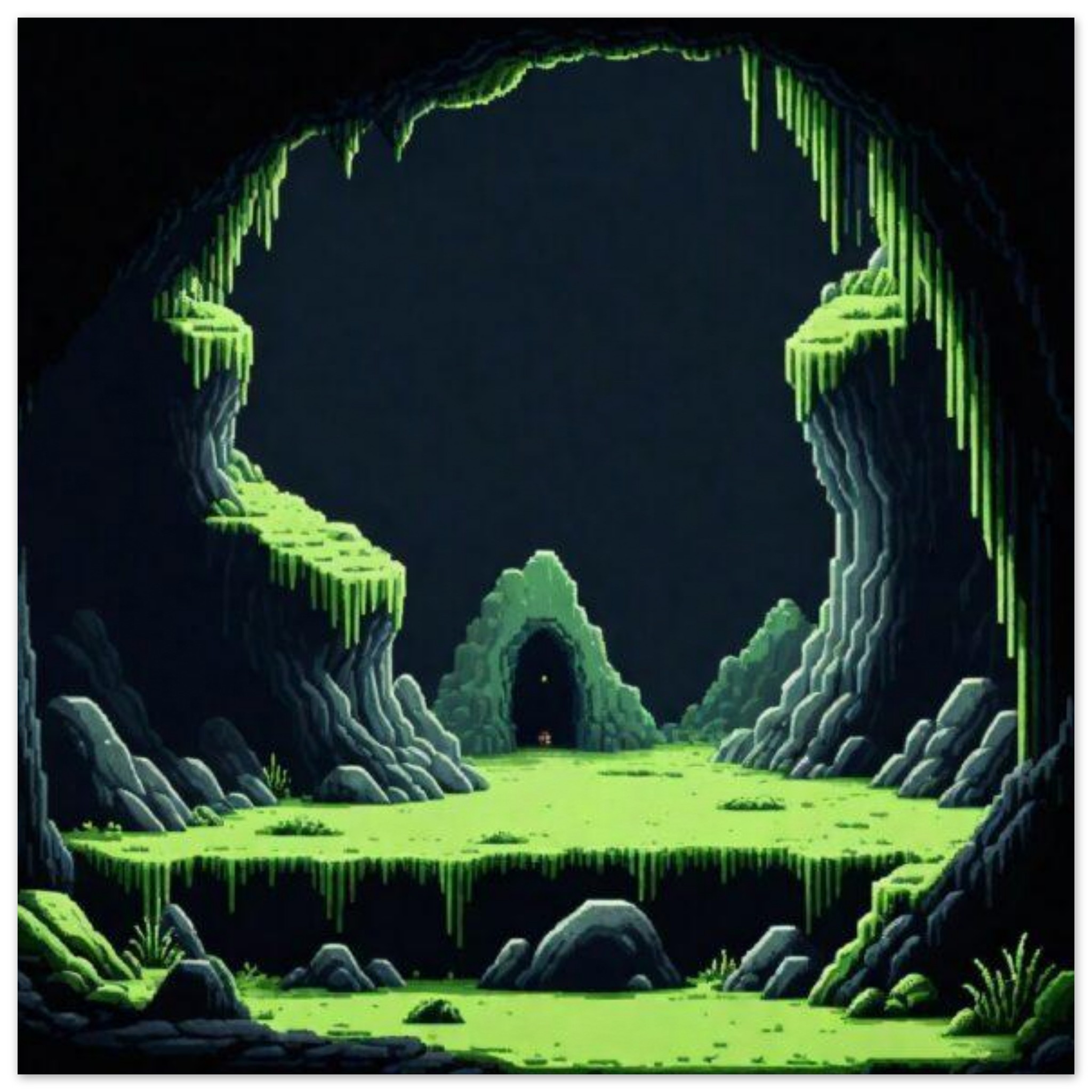 A video game scene depicting a cave with lush green plants, set against a backdrop of dark rock formations. The cave entrance is partially obscured by the vibrant foliage, creating a sense of mystery and adventure. The overall color scheme is dominated by shades of black and green, with a subtle accent color of 6EB516 adding contrast. The image conveys a sense of exploration and discovery, inviting the viewer to immerse themselves in the virtual world. This captivating scene evokes a feeling of wonder and excitement, drawing players into the enchanting realm of the game.