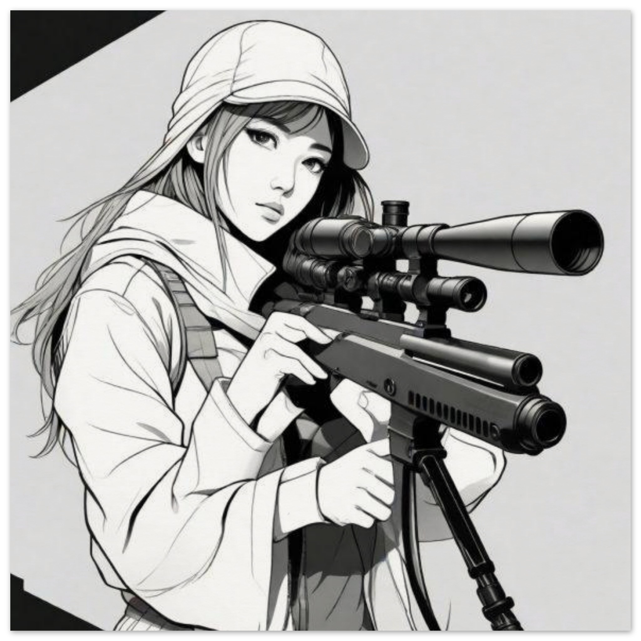 A black and white sketch featuring a woman holding a rifle. The woman’s face is not visible in this cartoon drawing. The dominant colors in the image are white, grey, and black, with an accent color of a dark grey. The image is a simple illustration of a person holding a gun, with the gun taking up a significant portion of the drawing. This artwork could be described as a cartoon of a person holding a firearm, specifically a rifle. The sketch is detailed and clear, making it easy to identify the subject and the weapon being held.