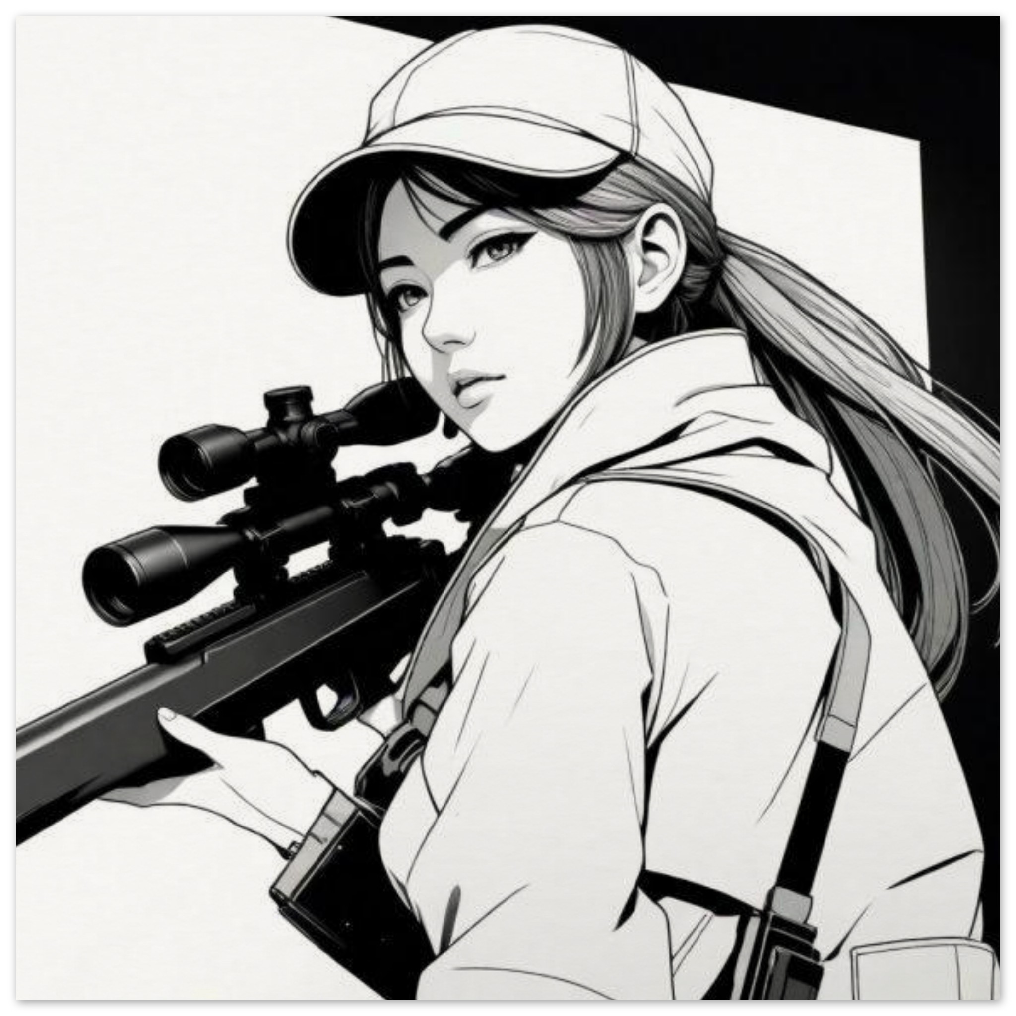 A black and white sketch of a woman holding a rifle is depicted in this image. The illustration portrays a person with a human face, dressed in clothing, and holding a firearm. The dominant colors in the image are white, black, and grey, with an accent color of 6A6A61. The picture is a drawing that falls into the categories of weapon, sketch, anime, and cartoon. The image is primarily focused on the person holding the rifle, positioned towards the center of the frame. The overall composition gives off a serious and intense vibe.