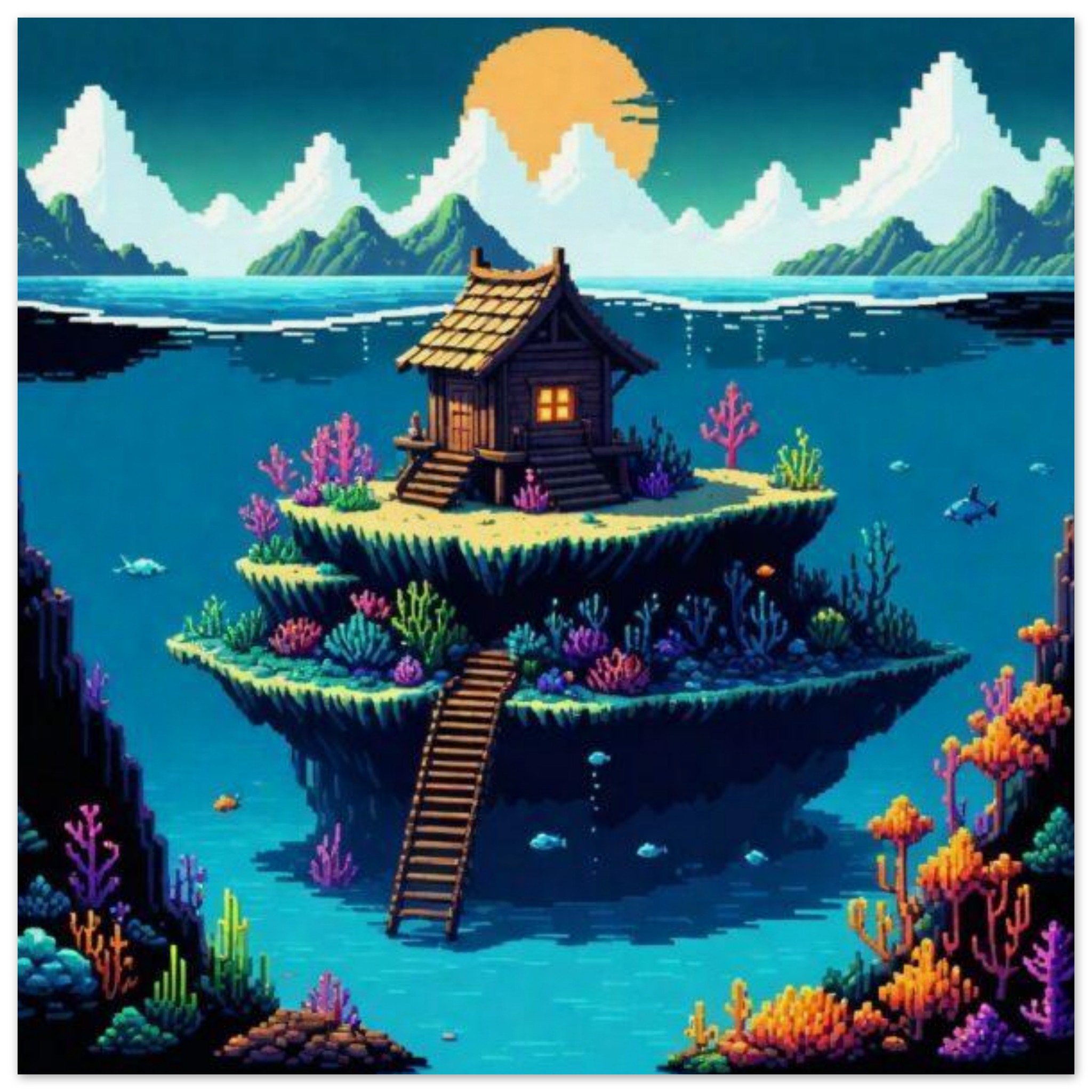 A serene scene depicting a house situated on a small island surrounded by calm waters. The image features a black background with the dominant foreground color being white. The color palette includes a vibrant accent color of 0E91B9. The setting includes a moon in the sky, creating a peaceful atmosphere. The artwork resembles a painting, with a hint of cartoonish elements. There is a subtle presence of a reef in the water, adding to the tranquility of the scene. Overall, this picturesque image evokes a sense of serenity and isolation in a beautiful and remote location.