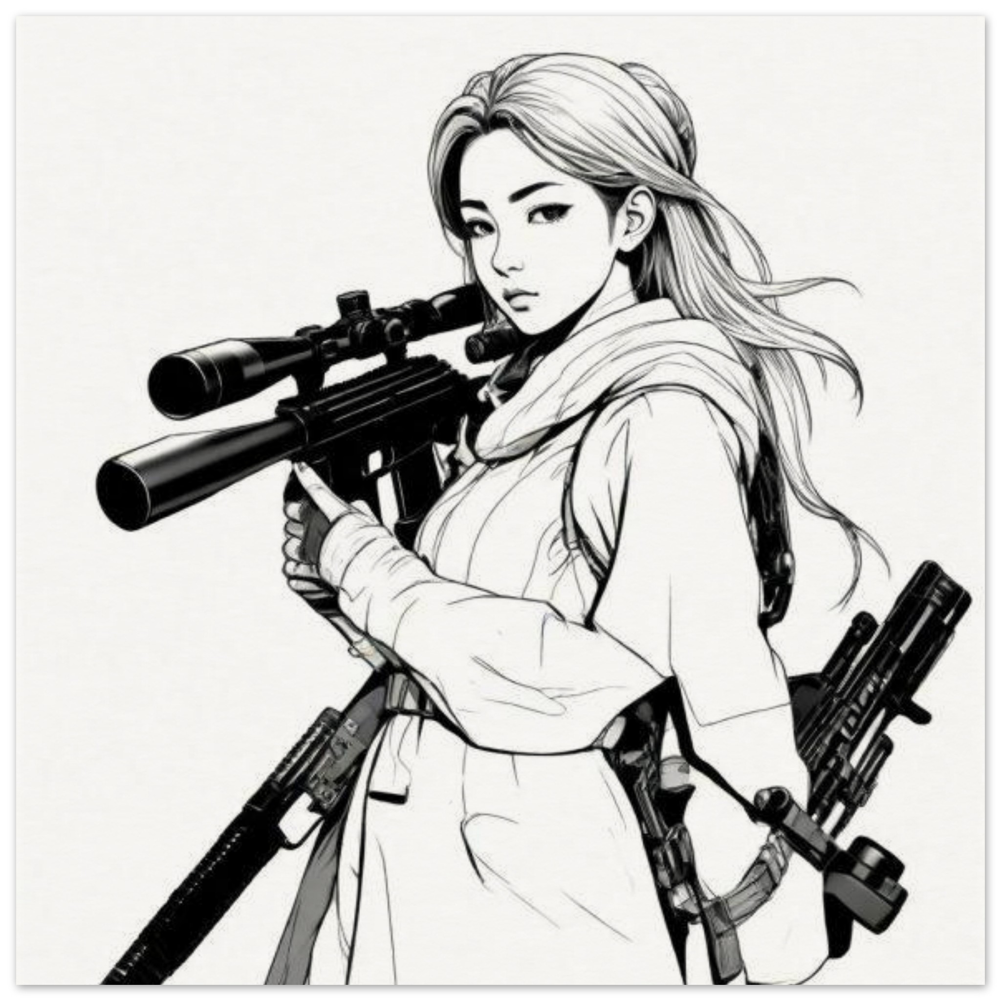 A black and white sketch of a woman holding a gun is depicted in this illustration. The woman’s face is drawn with detailed features, and she is holding a gun in her hand. The dominant colors in the image are white and black, with an accent color of 6C6C5F. The image is in black and white, giving it a classic and artistic look. The woman’s face is the main focus, with a gun prominently featured in the foreground. The image has a sketch-like quality, emphasizing the artistic style of the drawing.