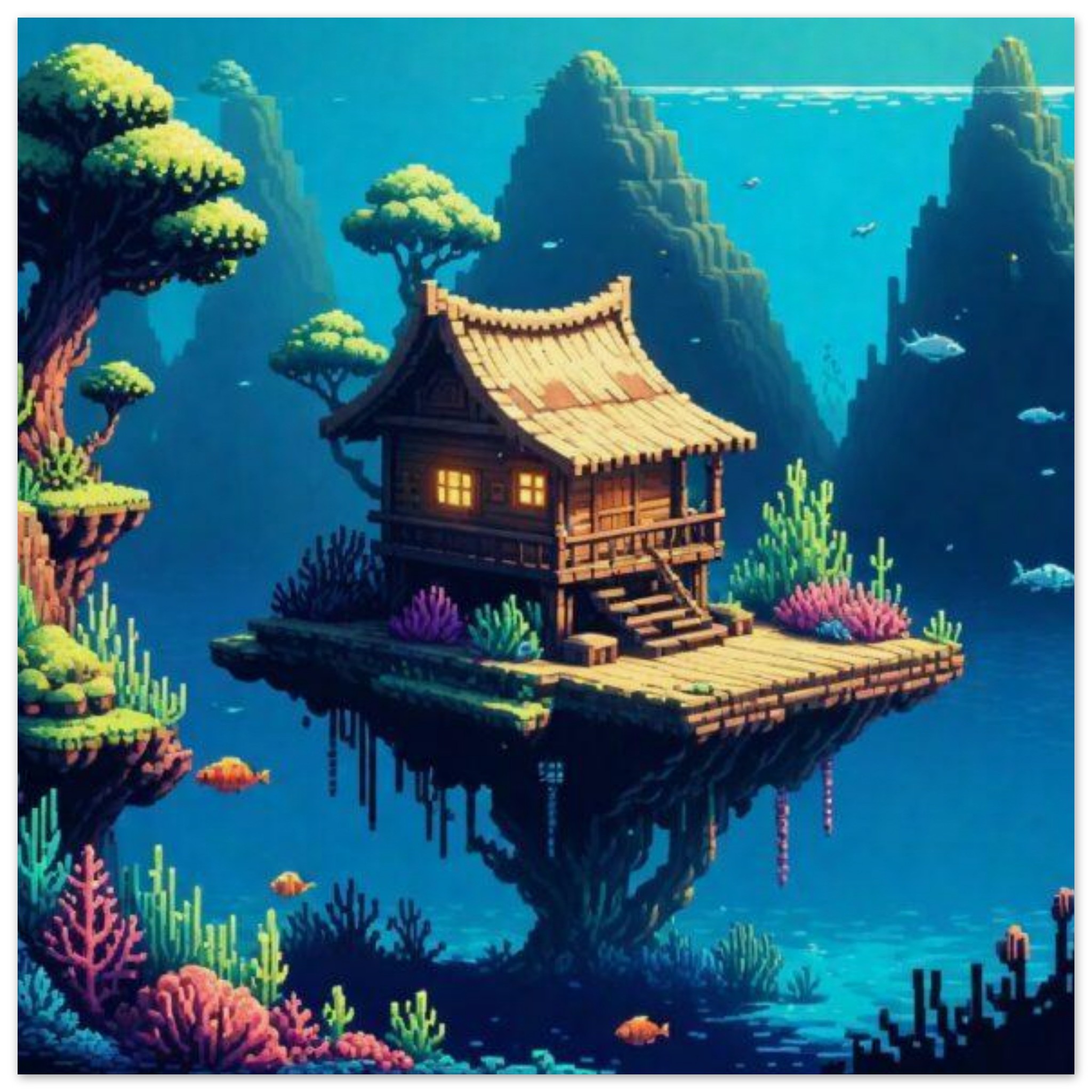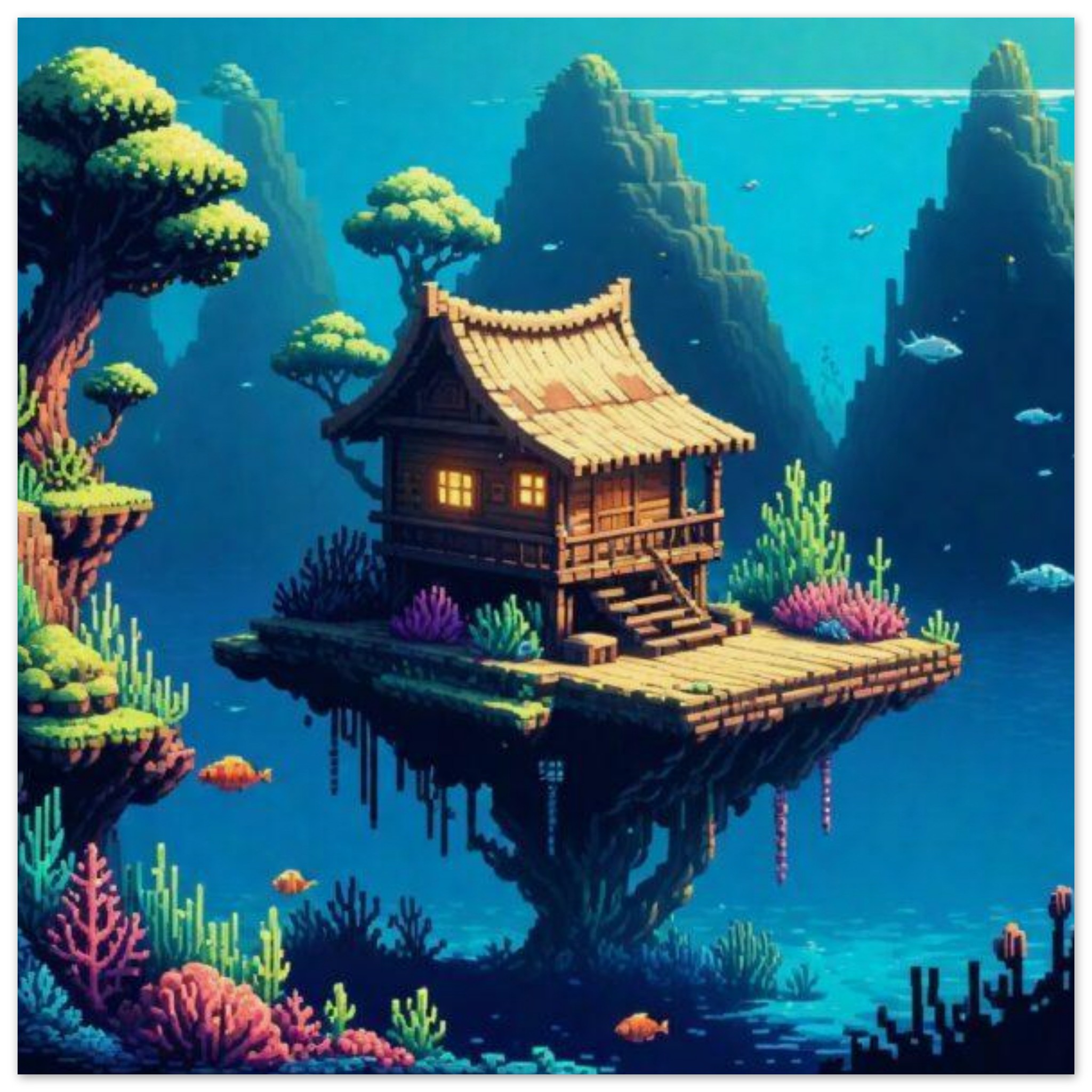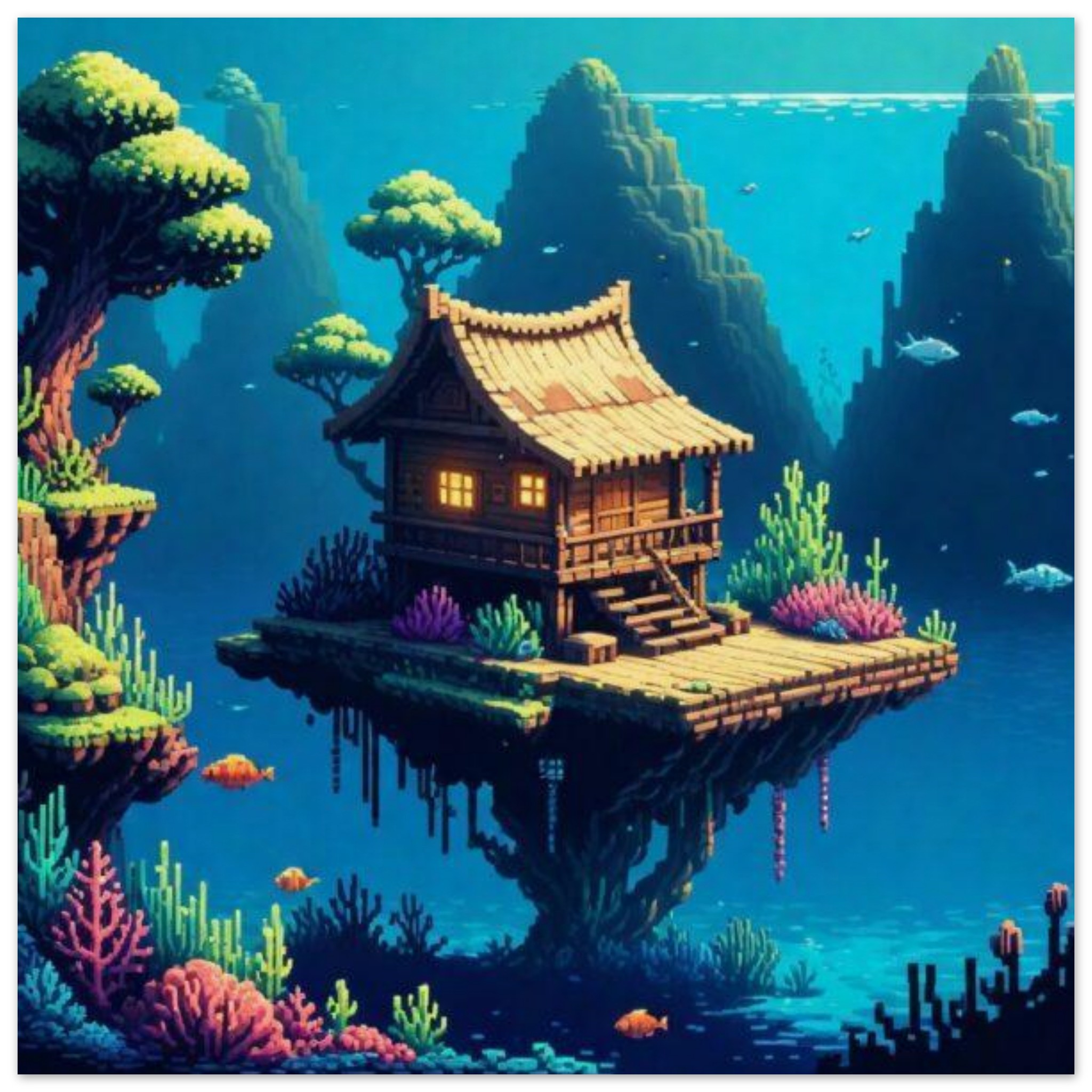 A serene painting depicting a house situated on a floating island in the middle of calm blue waters. The artwork showcases a peaceful scene with a temple-like structure surrounded by nature, including lush greenery and a reef in the distance. The dominant colors of blue create a soothing atmosphere, while the accent color of 0788B9 adds a touch of vibrancy. This picturesque setting evokes a sense of tranquility and beauty, inviting viewers to imagine themselves in this idyllic video game-like world where the house stands as a symbol of peaceful isolation in the midst of nature’s splendor.