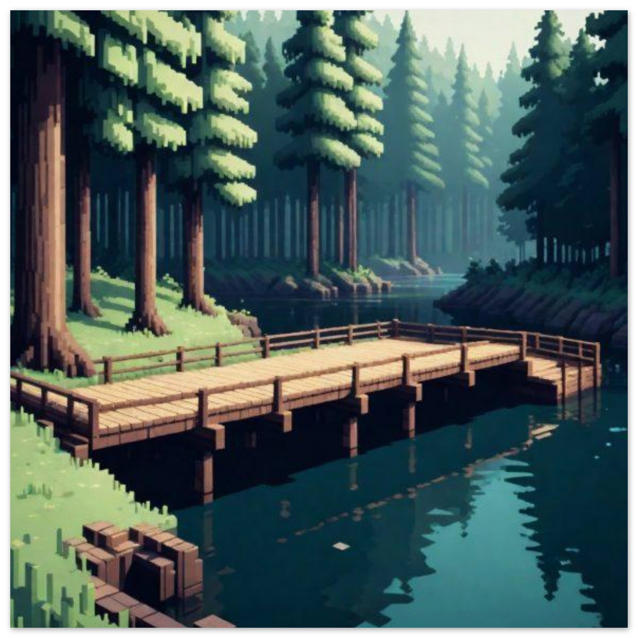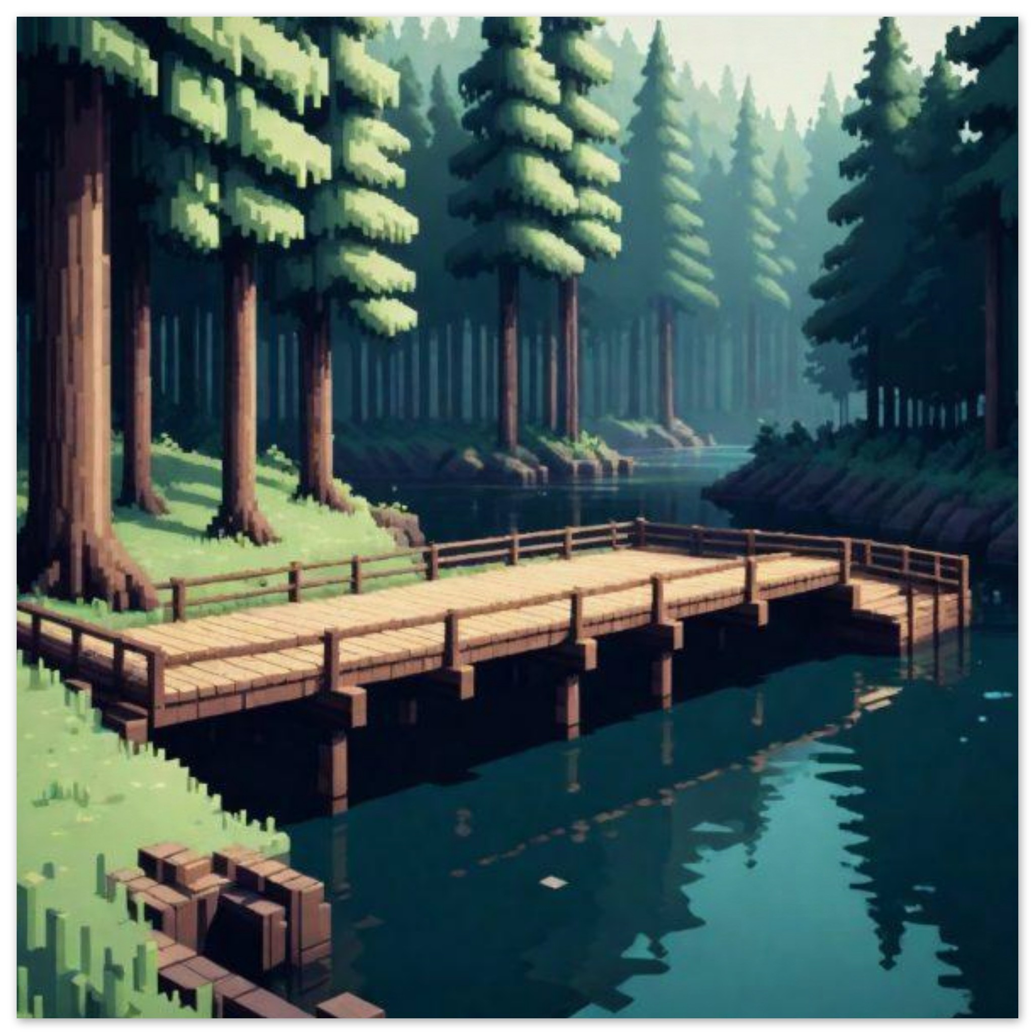 A serene scene of a bridge over calm water, surrounded by lush green trees and grass. The bridge is a simple structure with a wooden fence running along its edges. The dominant colors in the image are black and a deep blue accent color. The setting appears to be a peaceful lake in the outdoors, with no signs of adult, racy, or gory content. The image does not contain any objects, faces, celebrities, or landmarks. Overall, it showcases a tranquil and picturesque natural landscape perfect for relaxation and reflection.