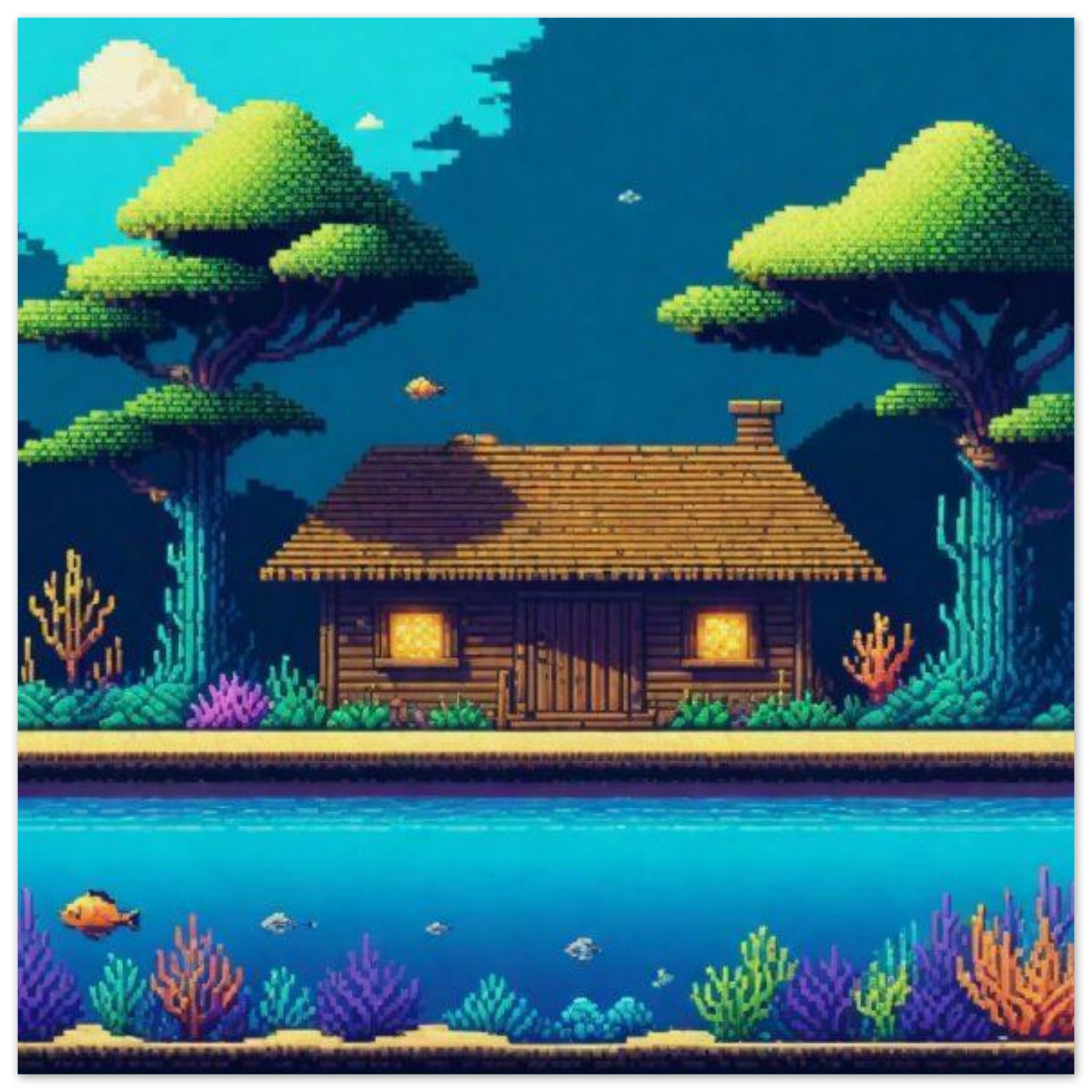 A beautiful pixel art scene depicting a serene setting by a river. In the artwork, there is a quaint house surrounded by lush green trees. The dominant color scheme consists of various shades of blue, creating a peaceful atmosphere. The image also includes a swimming pool in the foreground, adding a touch of leisure to the scene. The overall composition evokes a sense of tranquility and harmony with nature. This pixelated masterpiece resembles a video game screen, with intricate details such as fish and plants enhancing the visual appeal.