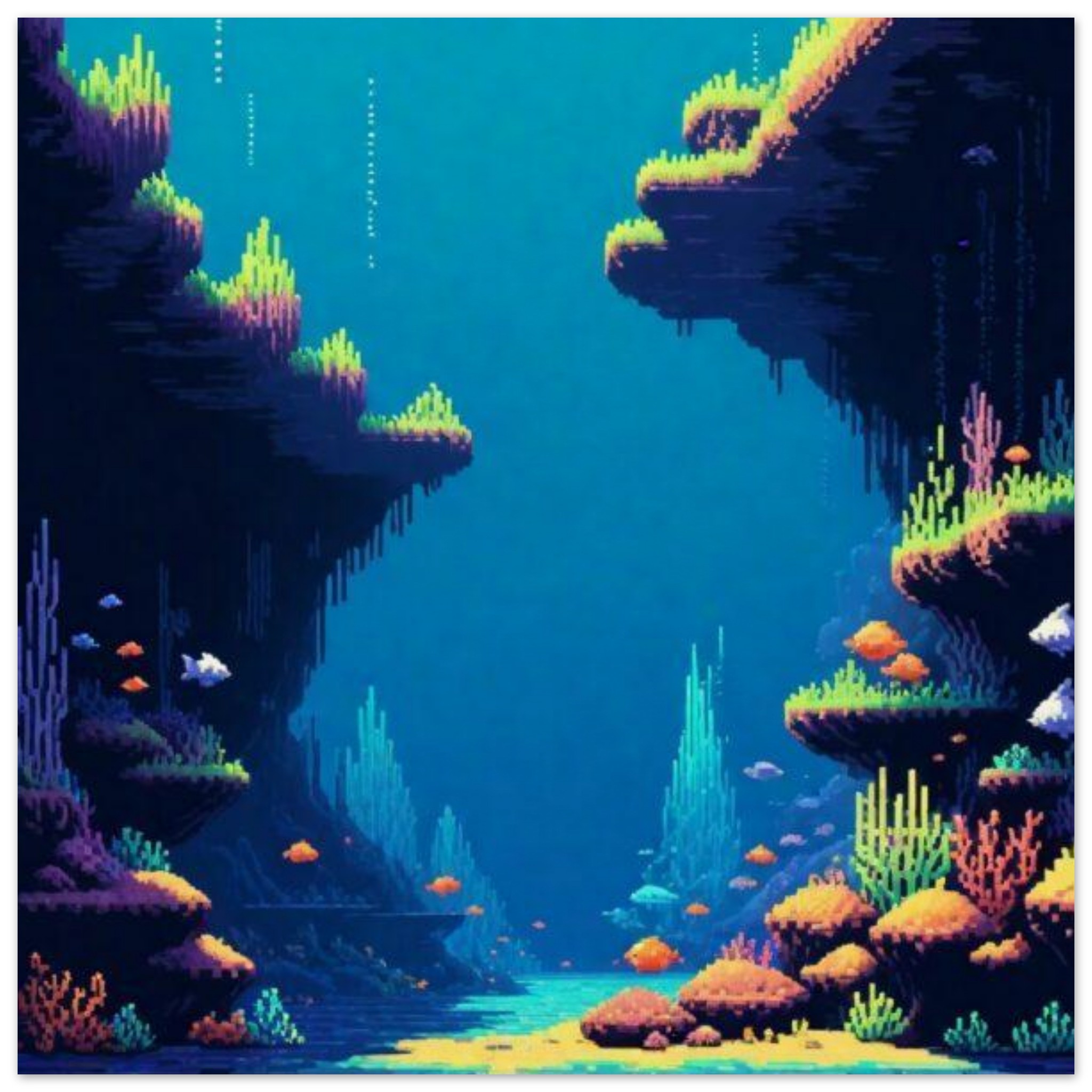 A video game of a video game is depicted in this image, showing pixelated graphics of a seabed with colorful fish, coral reefs, and marine life. The dominant colors are blue and black, with accents of 0286B7. The scene resembles an underwater aquarium, showcasing the beauty of nature with a marine biology theme. The image is not explicit or gory, suitable for all audiences. Overall, it presents a captivating and immersive digital world filled with aquatic organisms and a sense of exploration in a virtual realm.