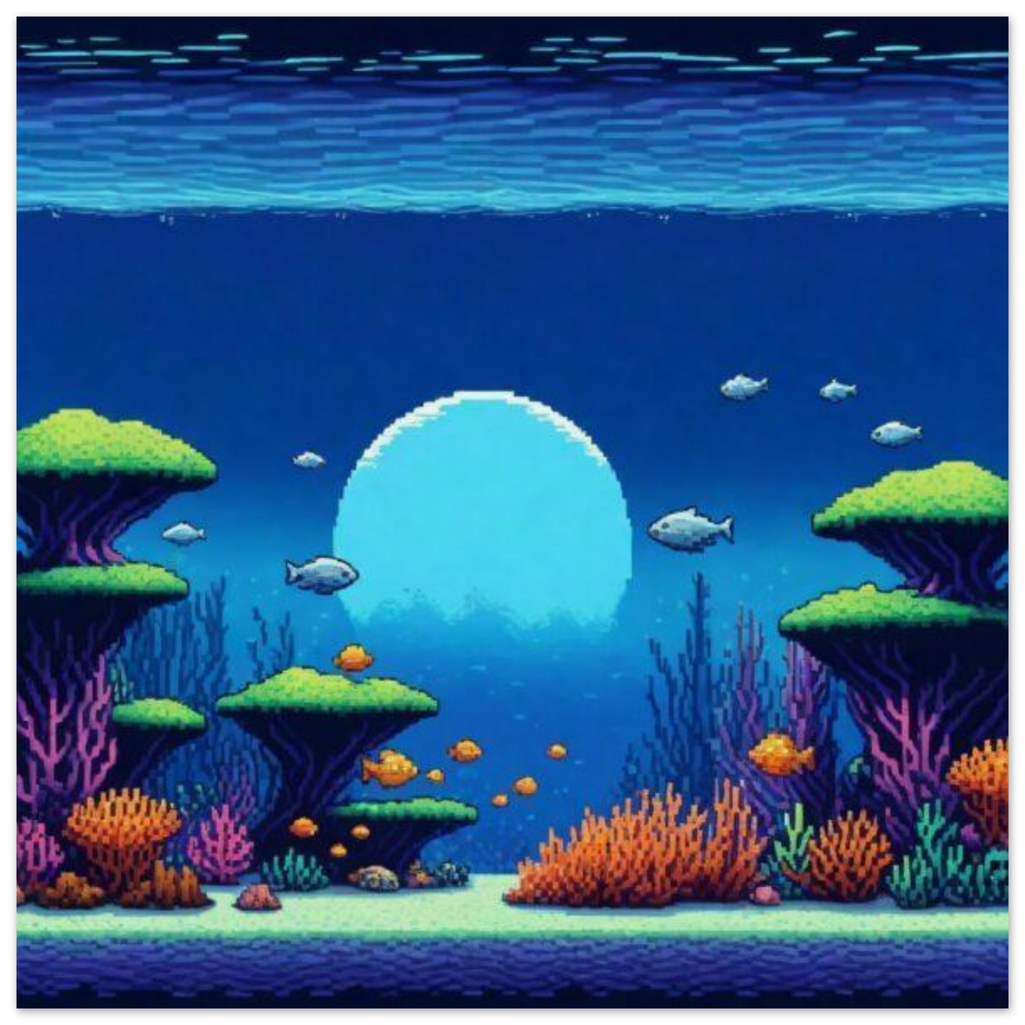 A video game screen displaying a vibrant underwater scene with an array of colorful fish swimming among intricate coral formations. The background is dominated by shades of blue, creating a serene and immersive aquatic environment. The image evokes a sense of tranquility and beauty, with hints of majorelle blue adding a pop of color. The intricate details of the reef and coelenterates add depth to the composition, making it feel like a realistic underwater world. Overall, the scene is captivating and visually appealing, offering a glimpse into a mesmerizing digital oceanic realm.