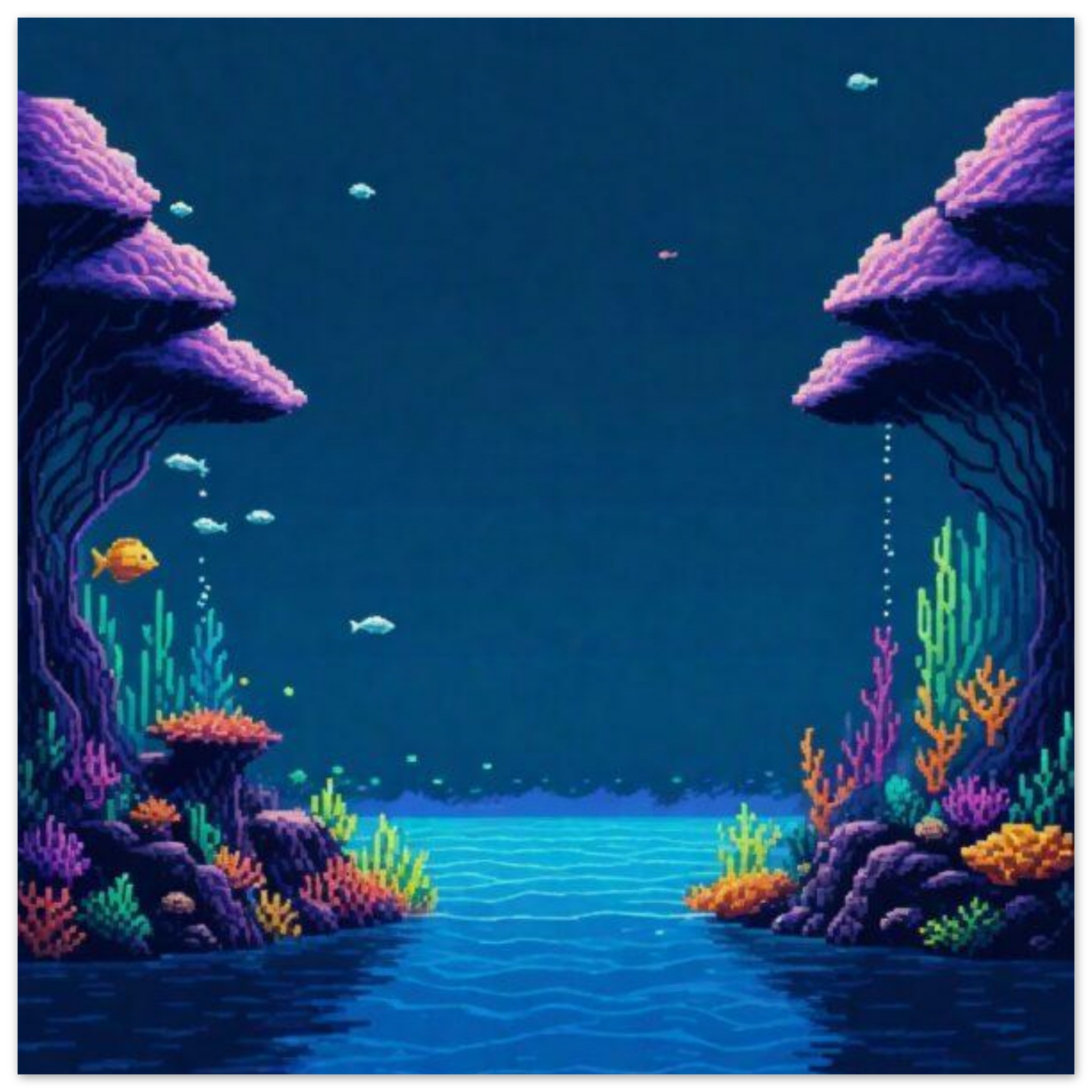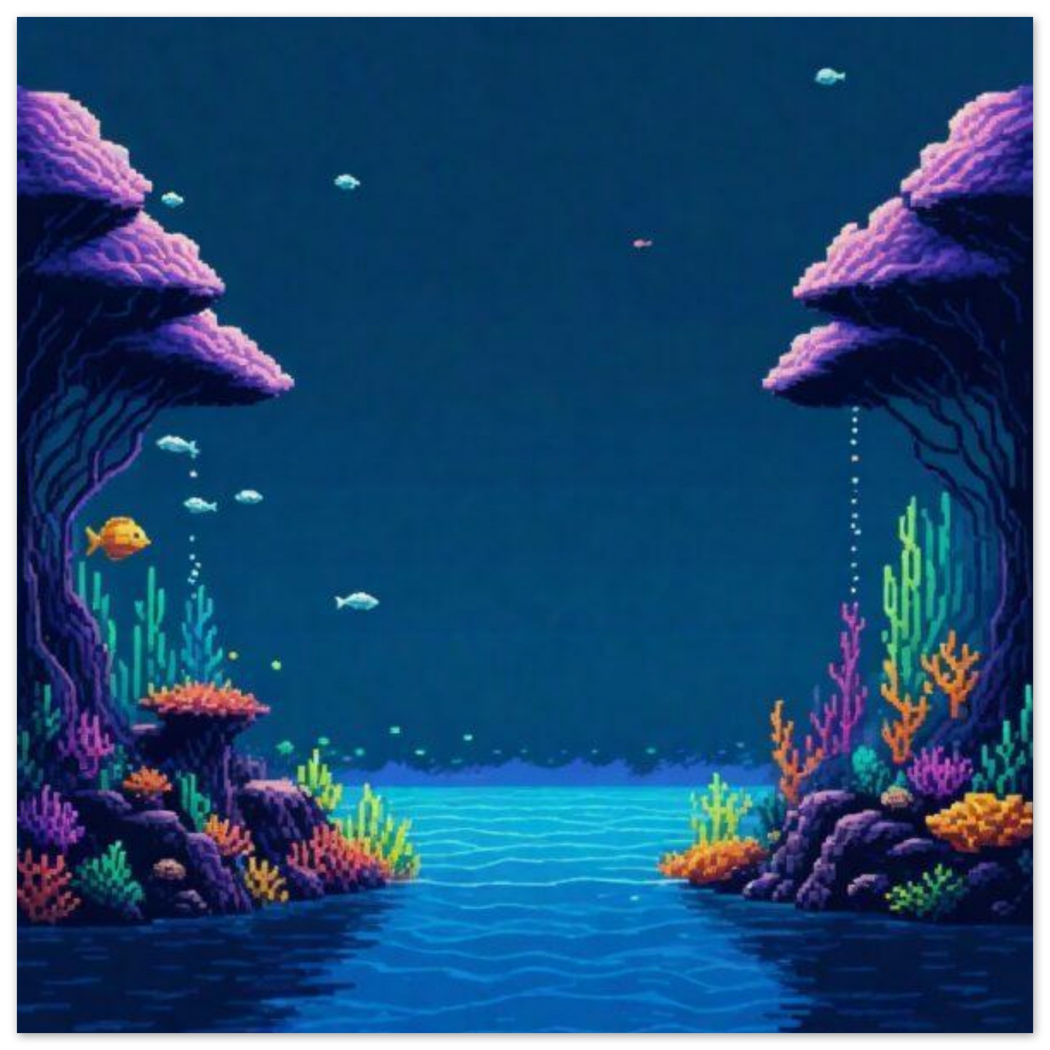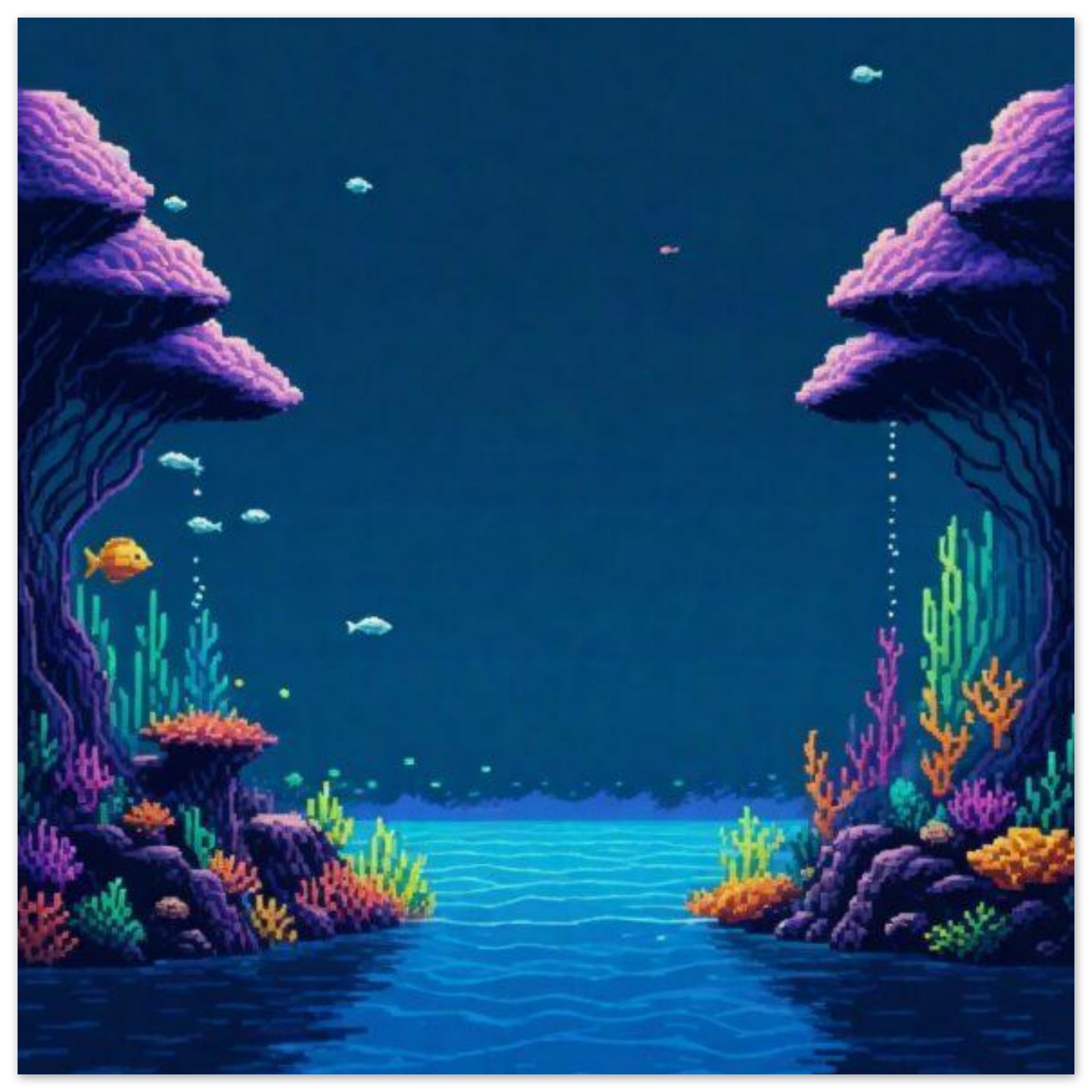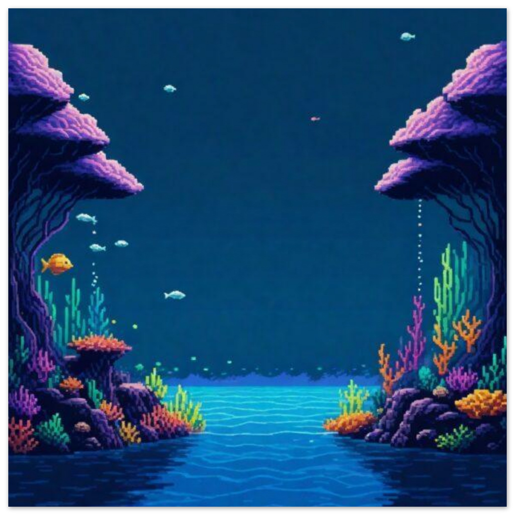A detailed pixel art illustration depicting a vibrant coral reef scene, with a dominant color palette of various shades of blue. The artwork showcases underwater flora and fauna, including fish and coral formations. The composition features a majorelle blue background that enhances the aquatic theme. The image evokes a sense of tranquility and beauty, resembling a video game screen with animated marine life. The detailed design captures the essence of a colorful and lively underwater world, making it a visually appealing and immersive depiction of a coral reef ecosystem.