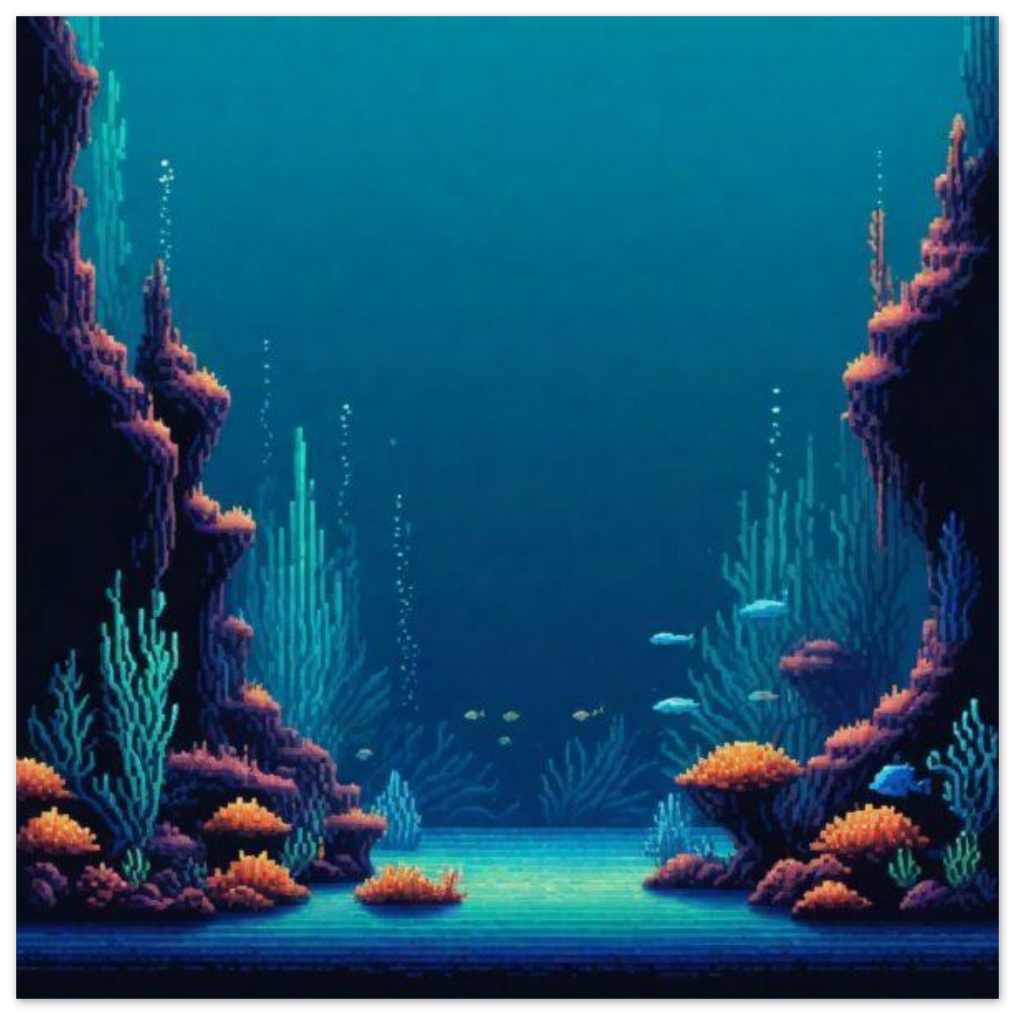 A detailed pixel art depiction of a vibrant coral reef, showcasing a mesmerizing underwater scene. The artwork measures 600×600 pixels and features a rich color palette dominated by shades of black and accented with a striking teal tone. The intricate design includes various marine organisms such as invertebrates, creating a lifelike aquarium setting. The image evokes a sense of marine biology and nature, with a focus on the beauty and complexity of coral reefs. This pixelated video game scene immerses viewers in a virtual underwater world, reminiscent of the wonders found in the depths of the ocean.