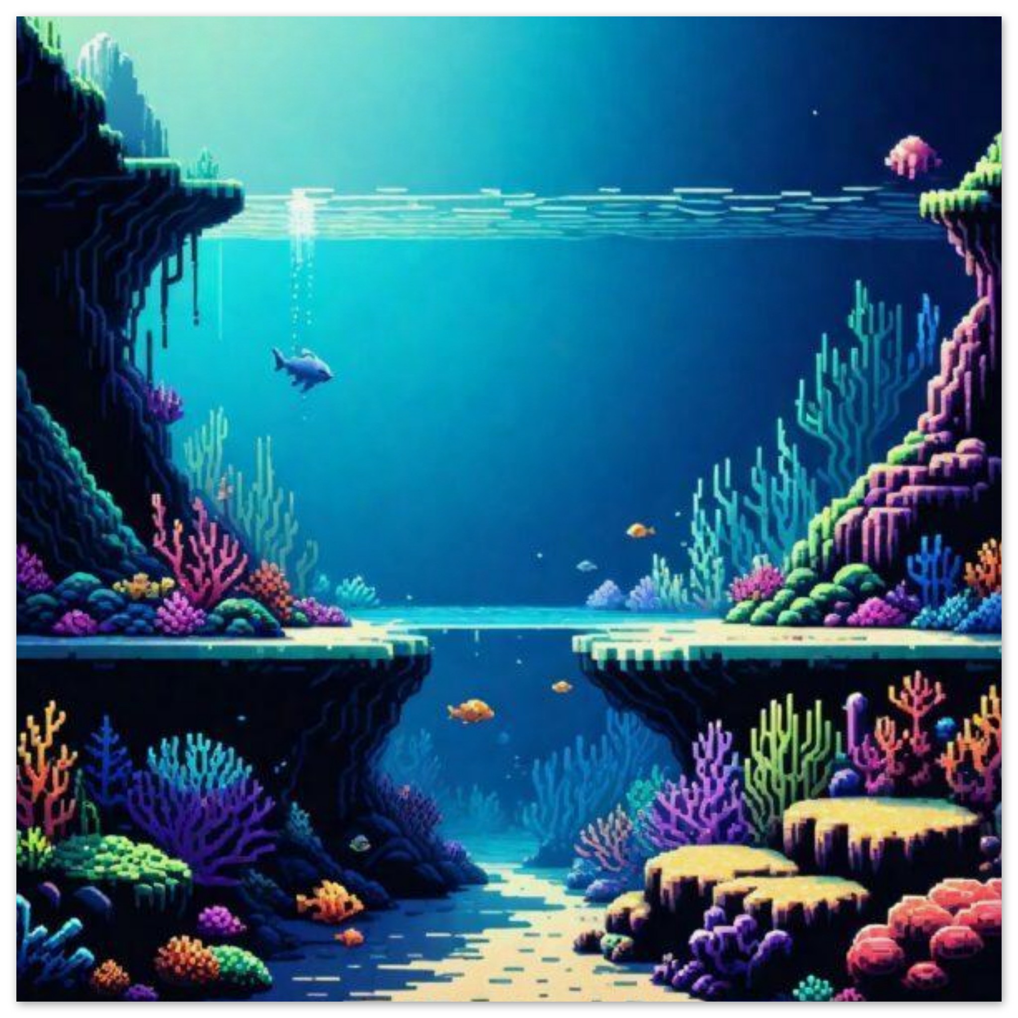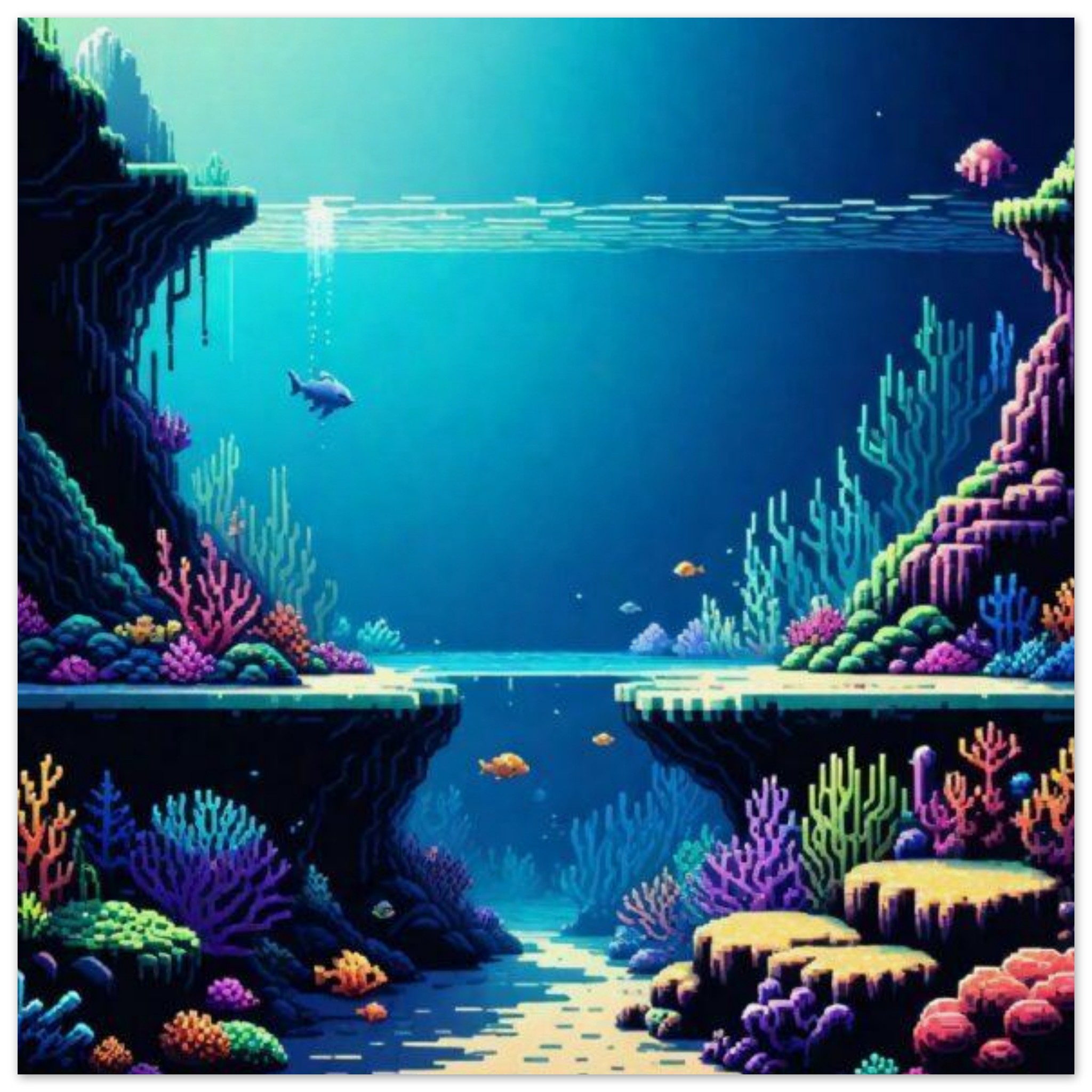 A detailed pixel art illustration depicting a vibrant fish swimming gracefully in a seabed environment. The scene showcases the fish surrounded by various marine elements like coral reefs and aquatic plants. The color palette consists of dominant shades of blue, black, and teal, with an accent color of 0B8DBB. The imagery evokes a sense of tranquility and beauty, capturing the essence of underwater life. This artwork is ideal for aquarium enthusiasts, marine biology enthusiasts, or anyone who appreciates the serene beauty of nature beneath the sea.