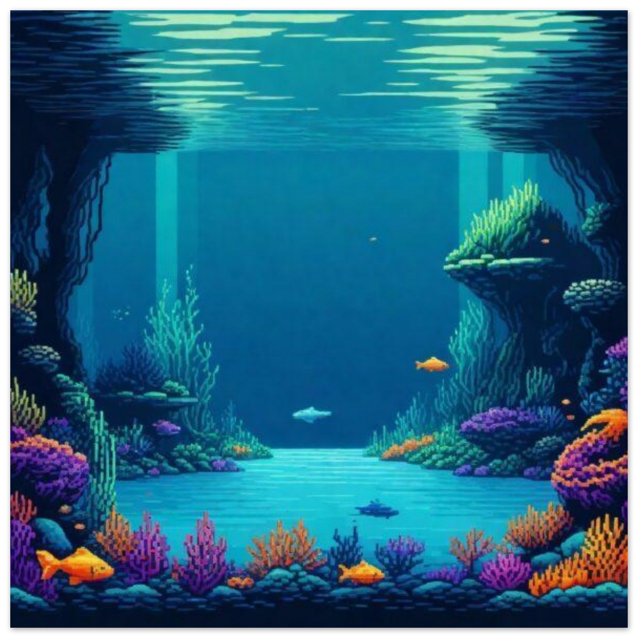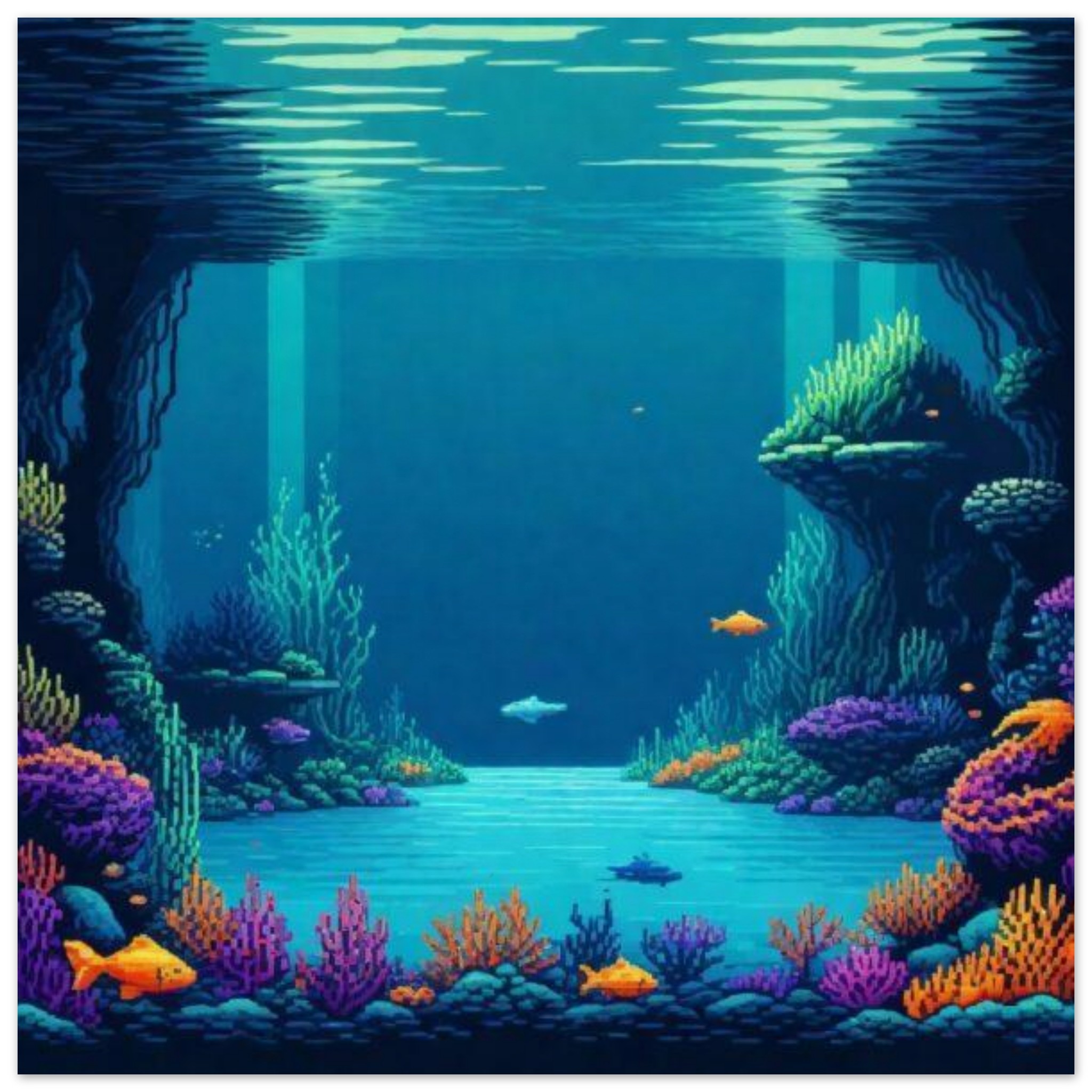 A detailed pixel art illustration depicting a vibrant seabed scene with various fish swimming among lush aquatic plants. The artwork showcases intricate details such as the shimmering blue water, teeming with life in shades of teal. The composition exudes a sense of tranquility and beauty, capturing the essence of marine biology and underwater ecosystems. This visually appealing image would be perfect for aquarium decor inspiration or as a serene backdrop for a freshwater aquarium. The artistry and attention to detail in this depiction of nature’s wonders are truly mesmerizing.