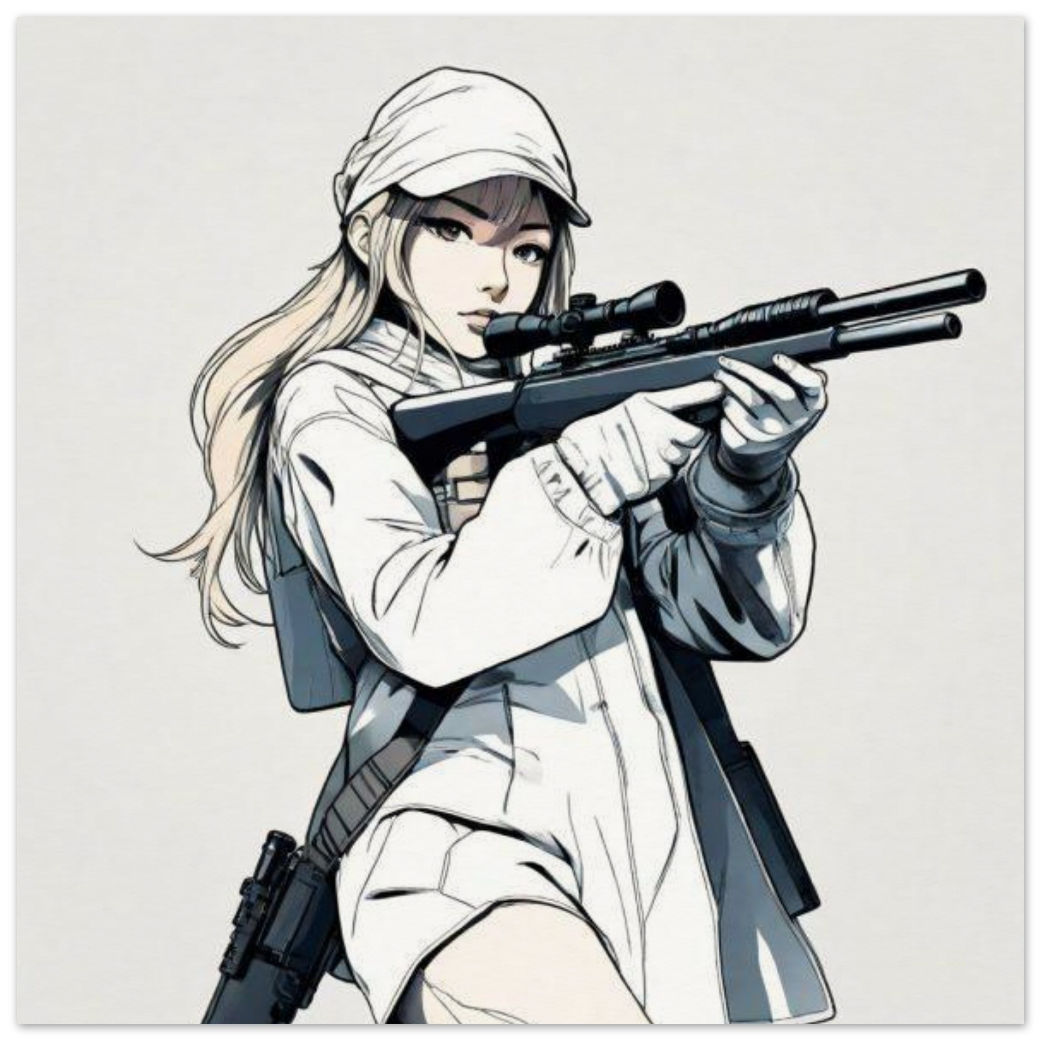 In this image, we see a woman holding a gun. The woman appears to be in a sketch or drawing style, with a dominant white background. The gun she is holding is a rifle, and there is a focus on the gun barrel. The image is not in black and white but has an accent color of 1B2127. The woman’s face is visible, and she is wearing clothing. The overall theme of the image is related to weapons, firearms, and shooting, with elements of a ranged weapon and a fictional character.