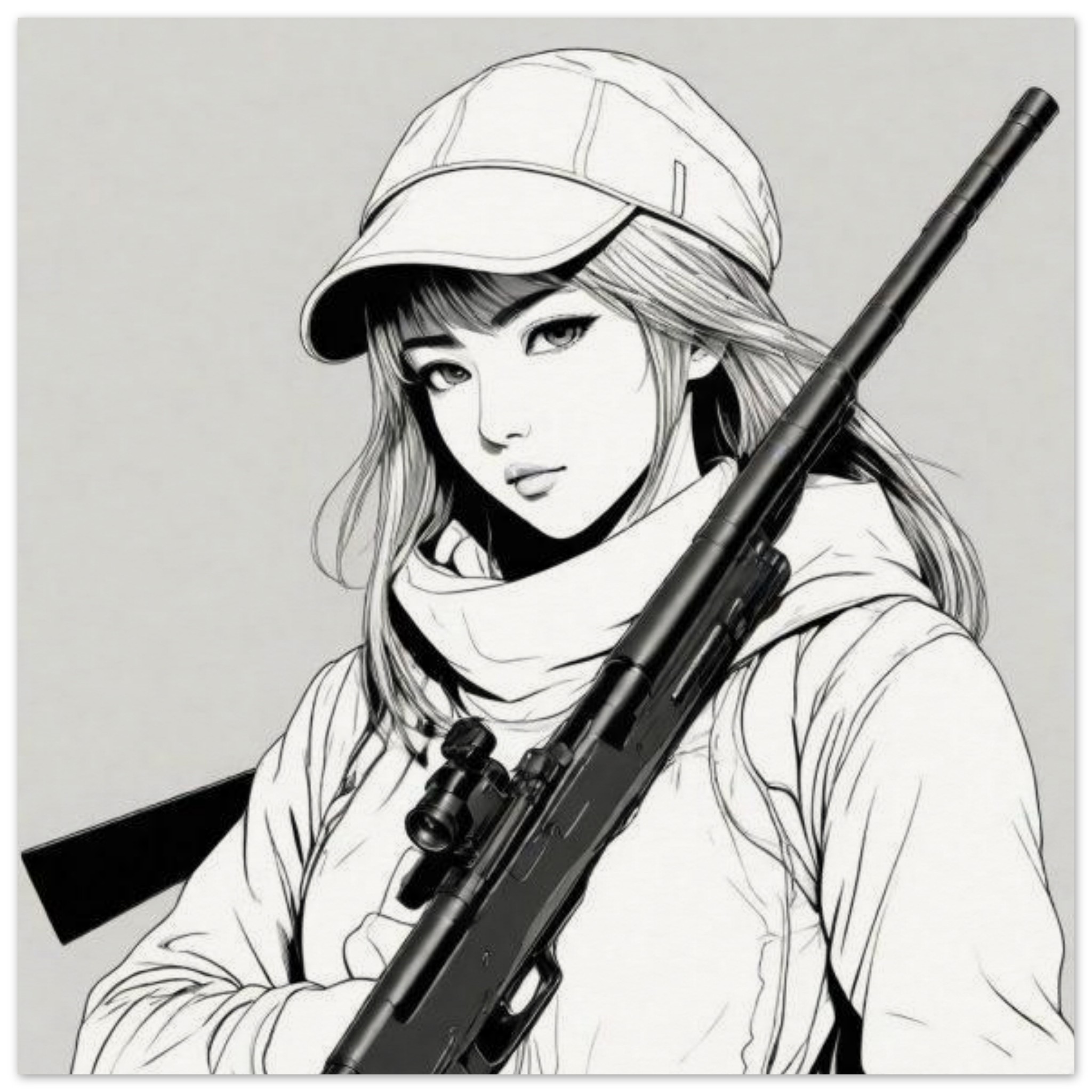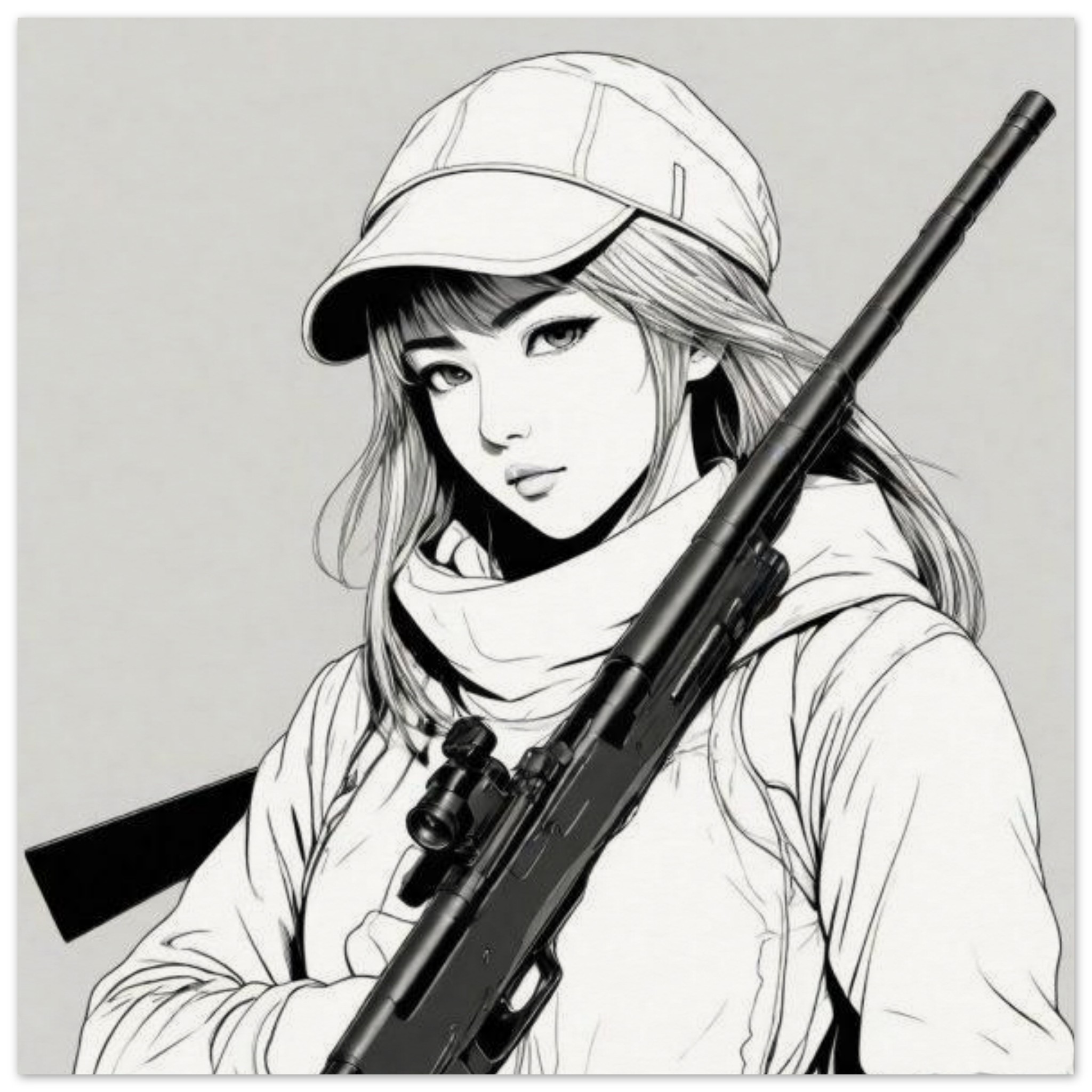 A black and white sketch of a woman holding a gun, with a dominant white background. The woman is wearing a hat and is positioned slightly off-center, with the gun pointed towards the viewer. The image is abstract in nature, resembling a drawing or cartoon. The woman’s face is partially visible in the center of the image. The gun is a rifle or shotgun, adding a sense of danger or action to the scene. The overall tone is serious and intense, with a focus on the weapon and the woman’s determined expression.